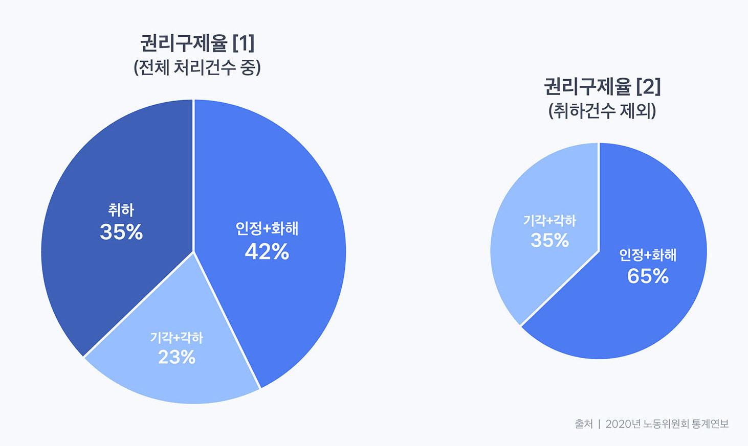 또 위 통계자료를 보면 단순 취하건수를 제외한 접수 사건의 65%가 근로자의 주장을 인정하는 판정을 내리거나, 사업주와 근로자가 일부 합의해 화해하며 종결했다는 것을 알 수 있습니다.