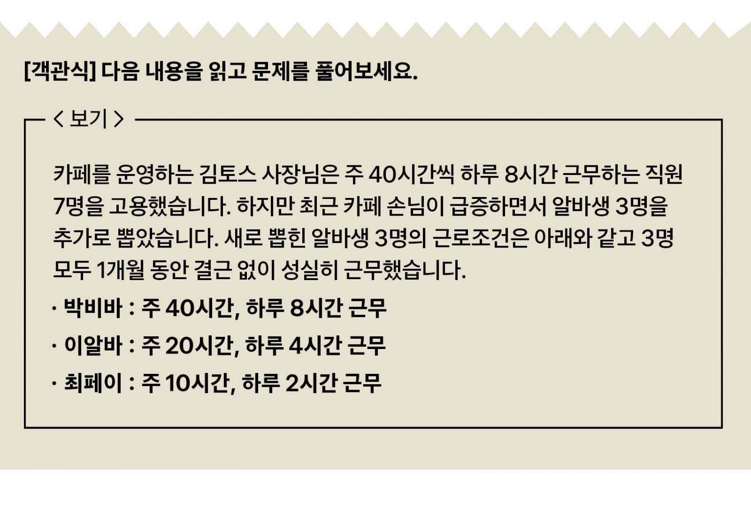 문제에서는 다른 직원들과 똑같이 주 40시간, 하루 8시간씩 근무하는 박비바를 제외한 이알바, 최페이를 단시간근로자로 볼 수 있습니다.