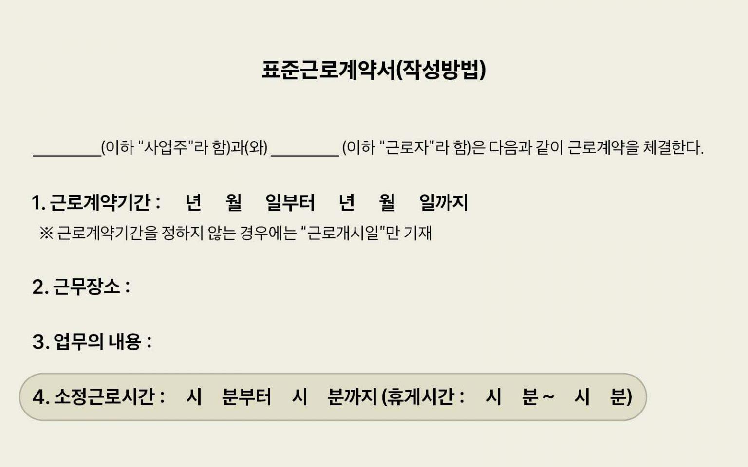 합의를 통해 법정근로시간(하루 8시간, 주 40시간)에서 하루 몇 시간 근무인지 적어야 합니다. 약속된 출퇴근 시간이 있다면 시간을 지정해 주시면 됩니다. 4시간을 일하면 휴게시간 30분이 주어집니다.