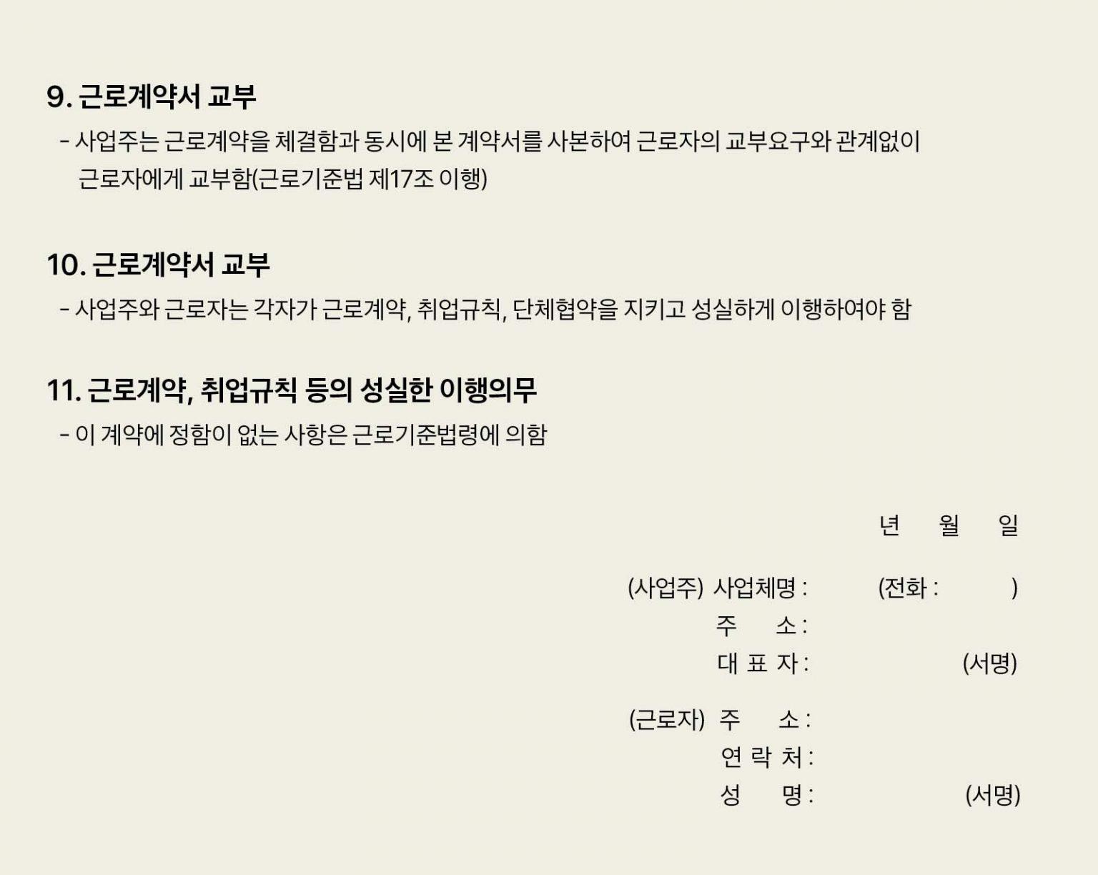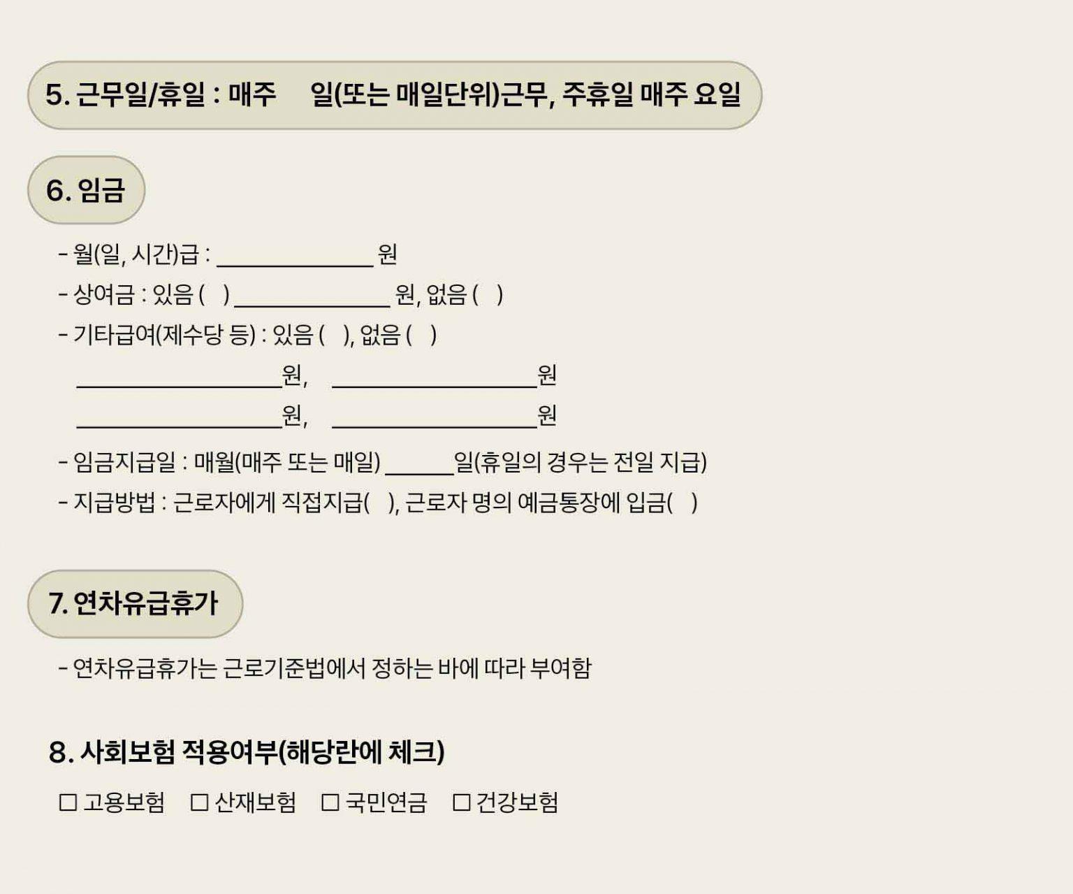 단, 5인 미만 사업장의 경우 ‘연차수당’에 대한 의무가 없기 때문에 근로계약서 내용에서 ‘연차유급휴가’ 항목을 제외해도 무방합니다.