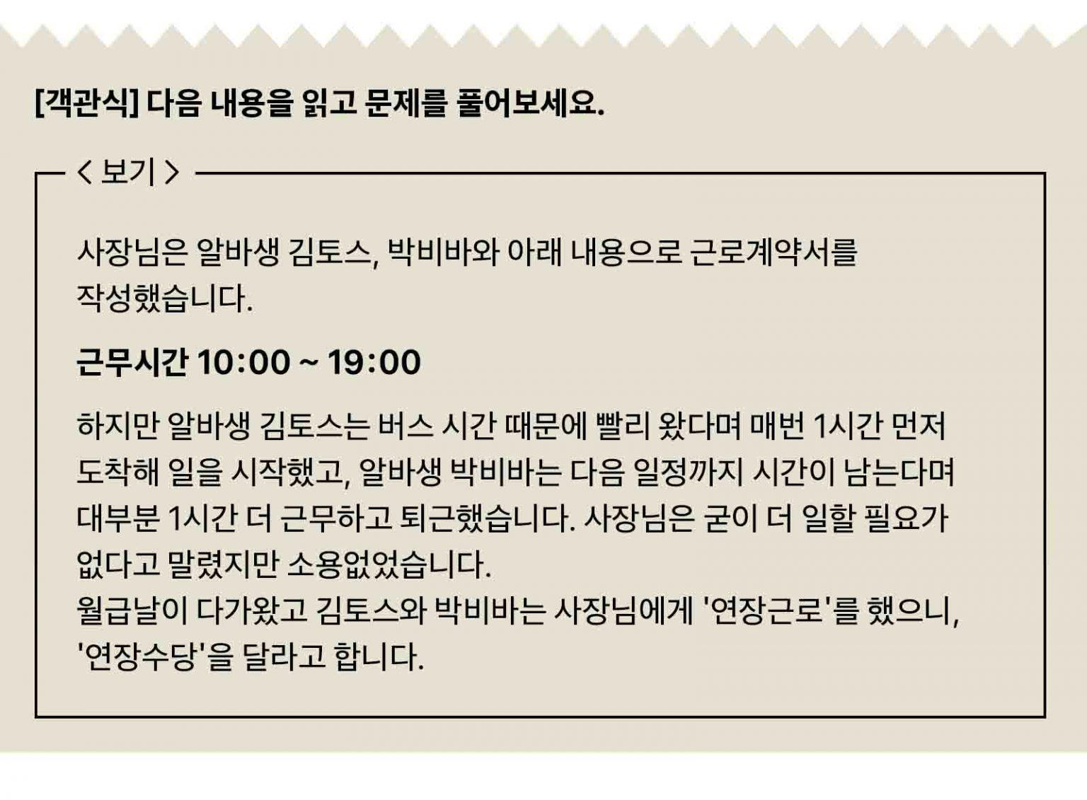 A. 정답은 ④ ‘사장님이 일을 하라고 한 적 없으니 김토스와 박비바 모두에게 연장수당을 주지 않아도 된다’ 입니다.