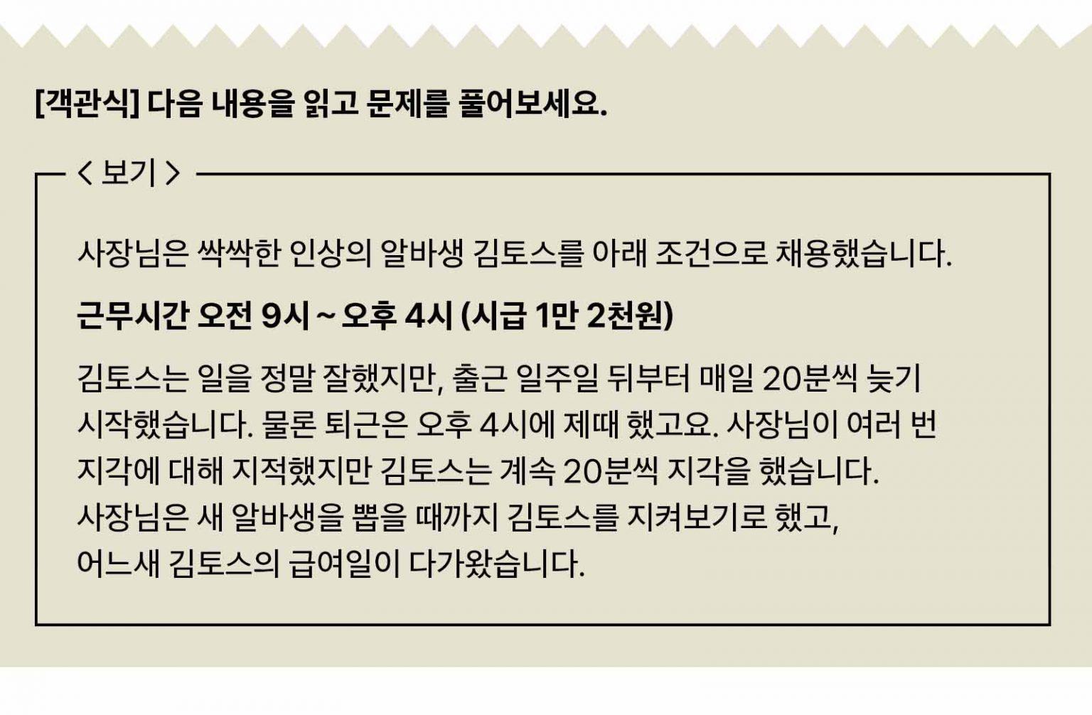 A. 정답은 ③ ‘전체 급여에서 ‘지각횟수 X 지각한 시간만큼의 급여’를 공제한다’입니다.