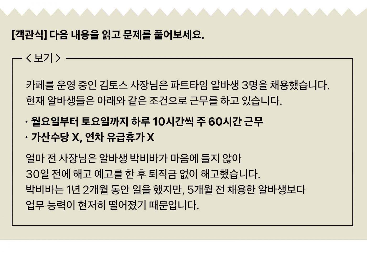 Q. 위 상황에서 5인 미만 사업장을 운영하는 김토스 사장님이 법적으로 잘못한 행위는 무엇일까요?