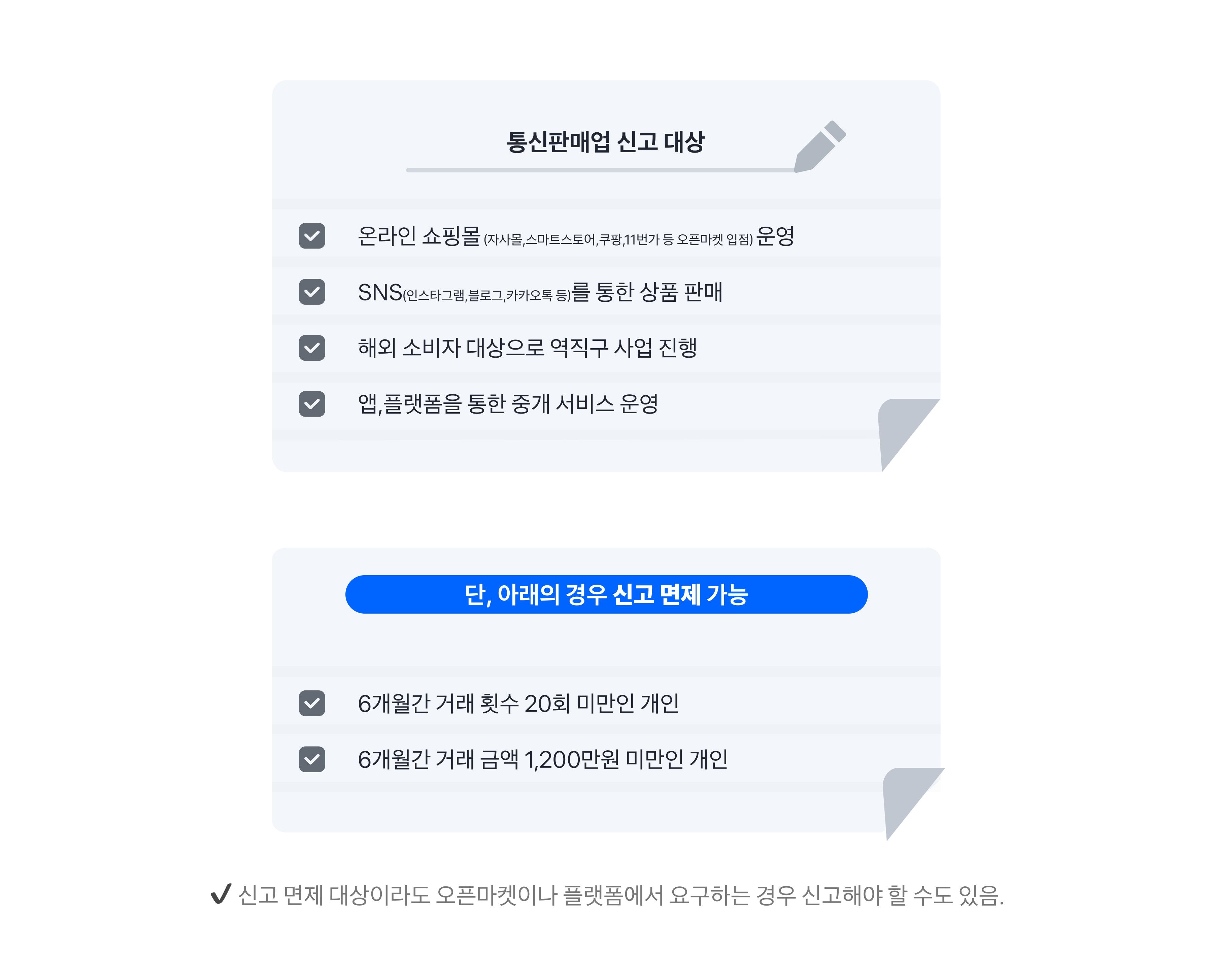 위 조건에 해당하는 경우 반드시 통신판매업 신고를 해야 해요. 단, 6개월간 거래 횟수 20회 미만 또는 거래 금액이 1,200만 원 미만인 개인이라면 오픈마켓이나 플랫폼에서 따로 요구하는 경우를 제외하고는 신고 면제가 가능하니 이점 참고하세요.