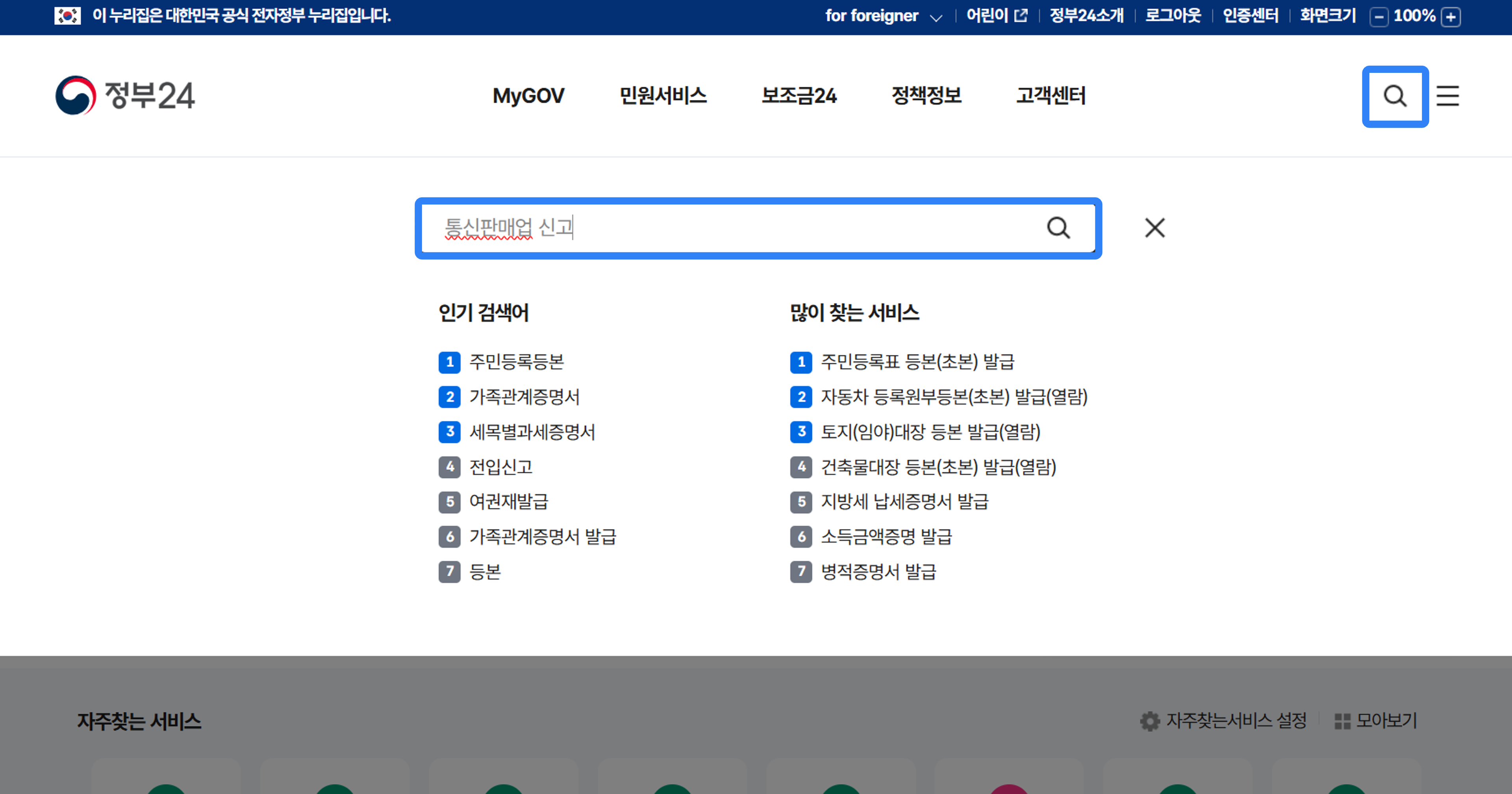 1) 정부24 로그인 후 우측 상단 돋보기 버튼 누르고 ‘통신판매업 신고’ 입력
