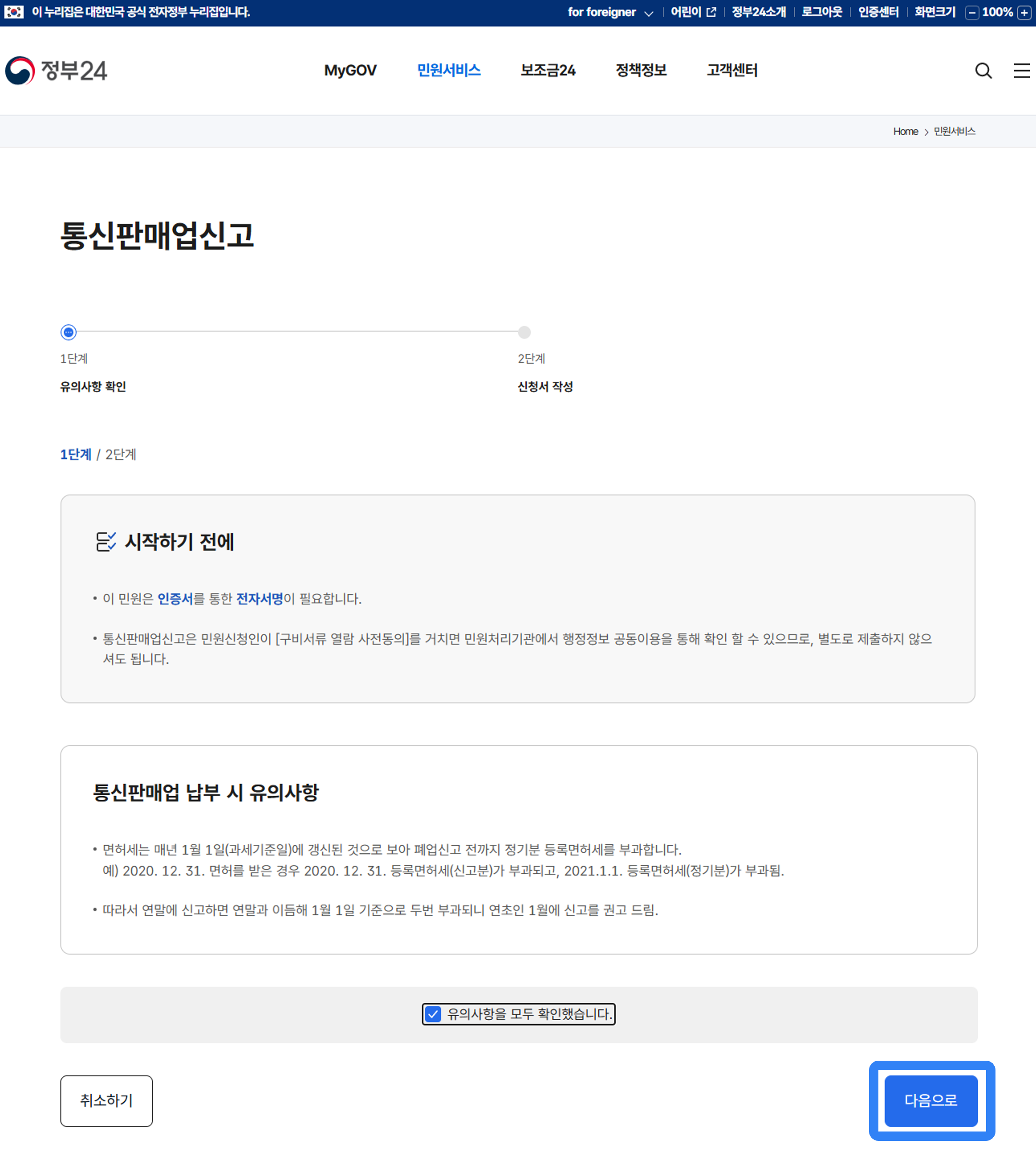3) 통신판매업 신고 유의사항 숙지 후 하단 ‘유의사항을 모두 확인했습니다.’ 체크하고 ‘다음으로’ 버튼 클릭