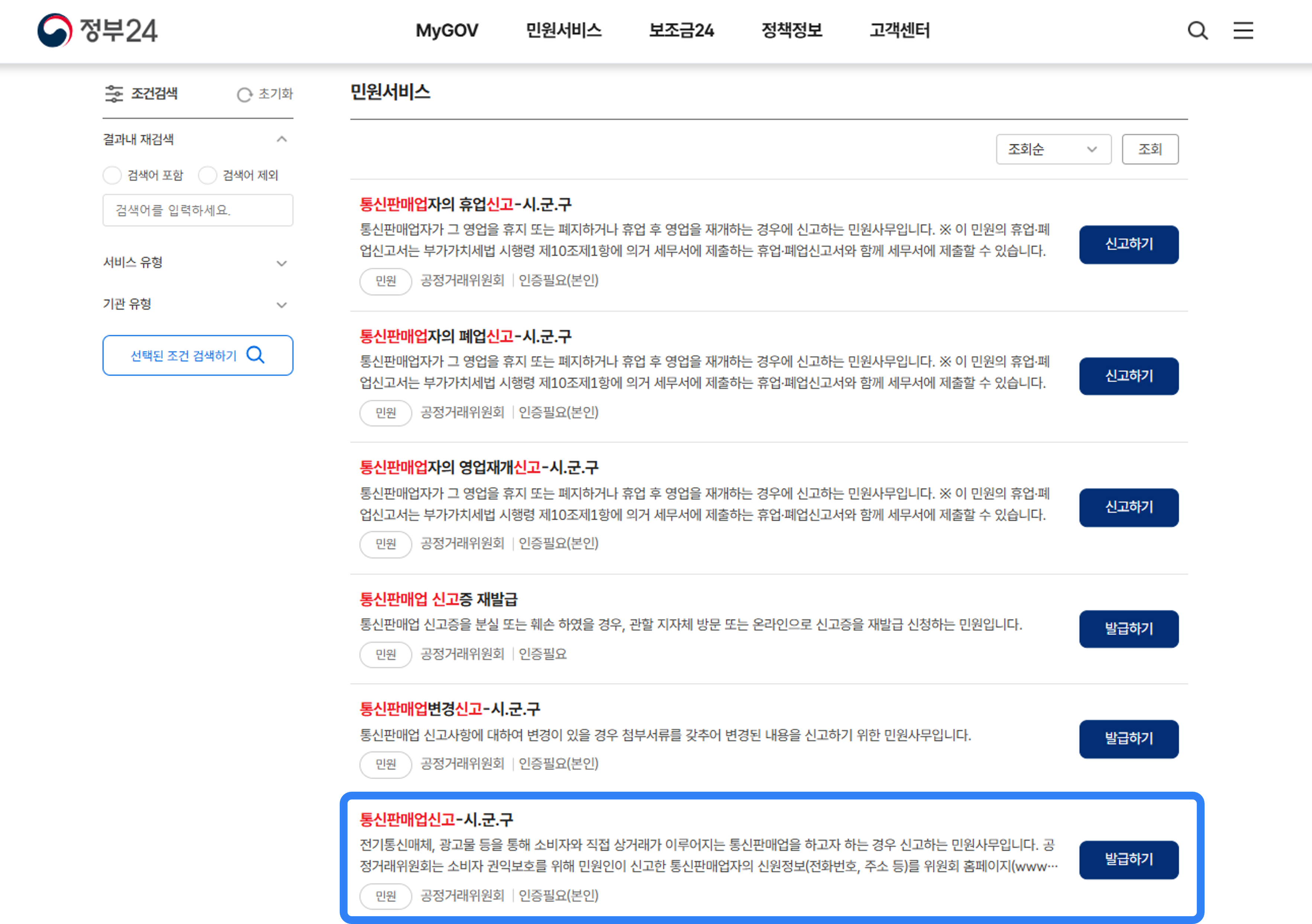 2) 민원서비스 목록 중 ‘통신판매업신고-시.군.구’ 발급하기 버튼 클릭