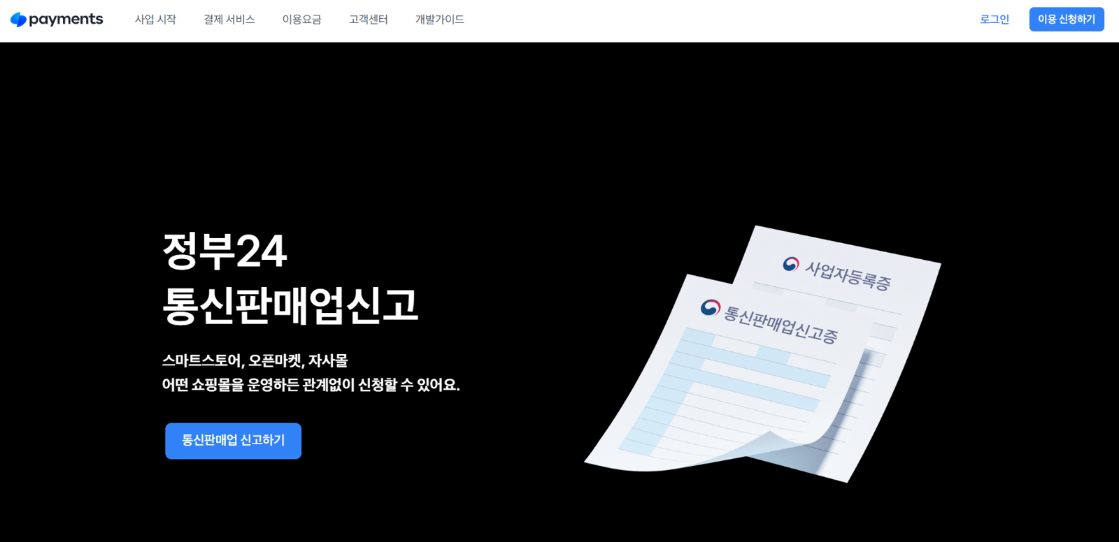 간편하게 통신판매업신고를 하고 싶은 사장님들을 위해 토스페이먼츠에서 ‘통신판매업 바로신청’ 서비스를 제공하고 있어요. 토스페이먼츠의 ‘통신판매업 바로신청’ 서비스를 이용하면 구매안전서비스 이용확인증 발급부터 통신판매업 신고까지 모든 걸 무료로 5분 만에 끝낼 수 있어요.