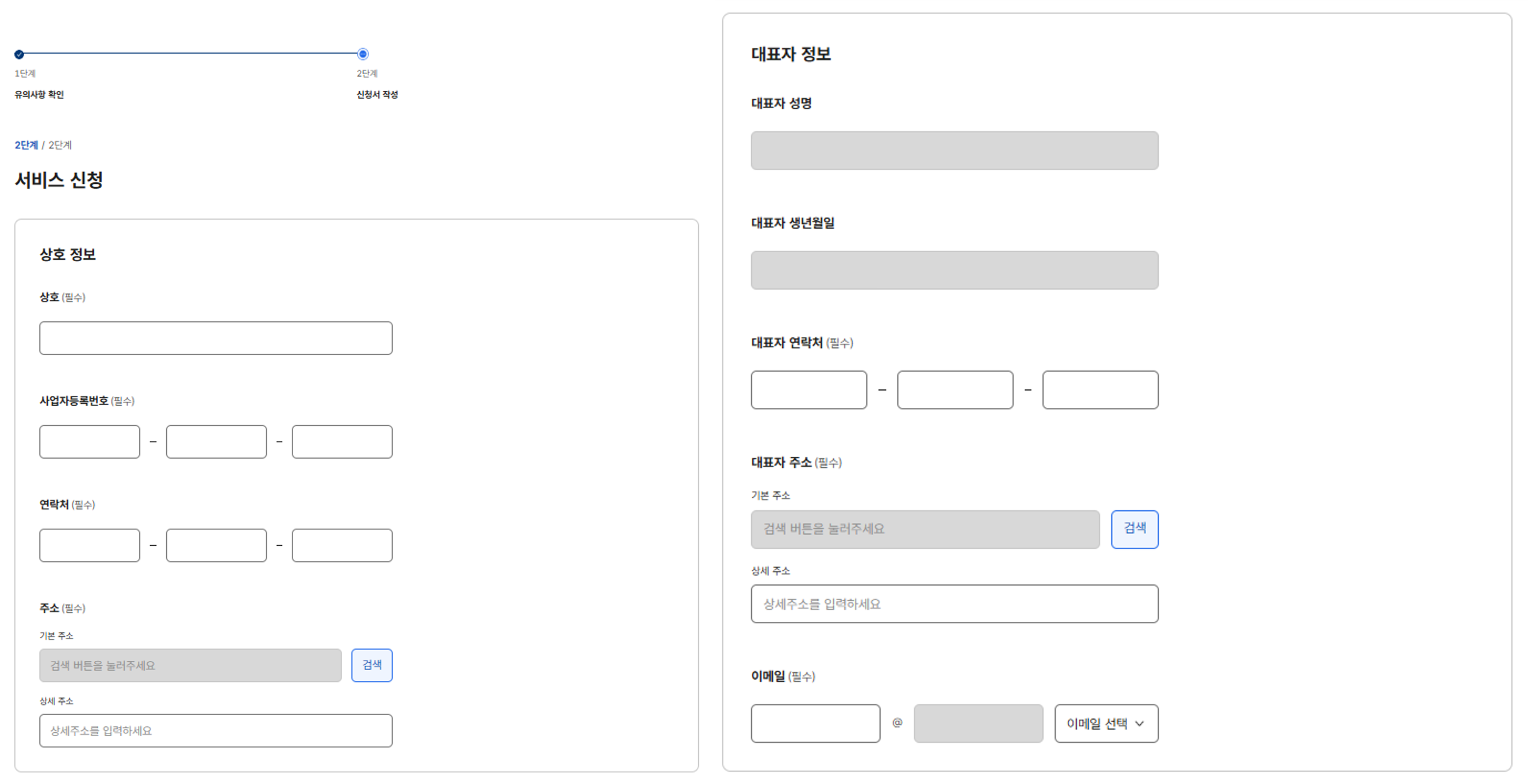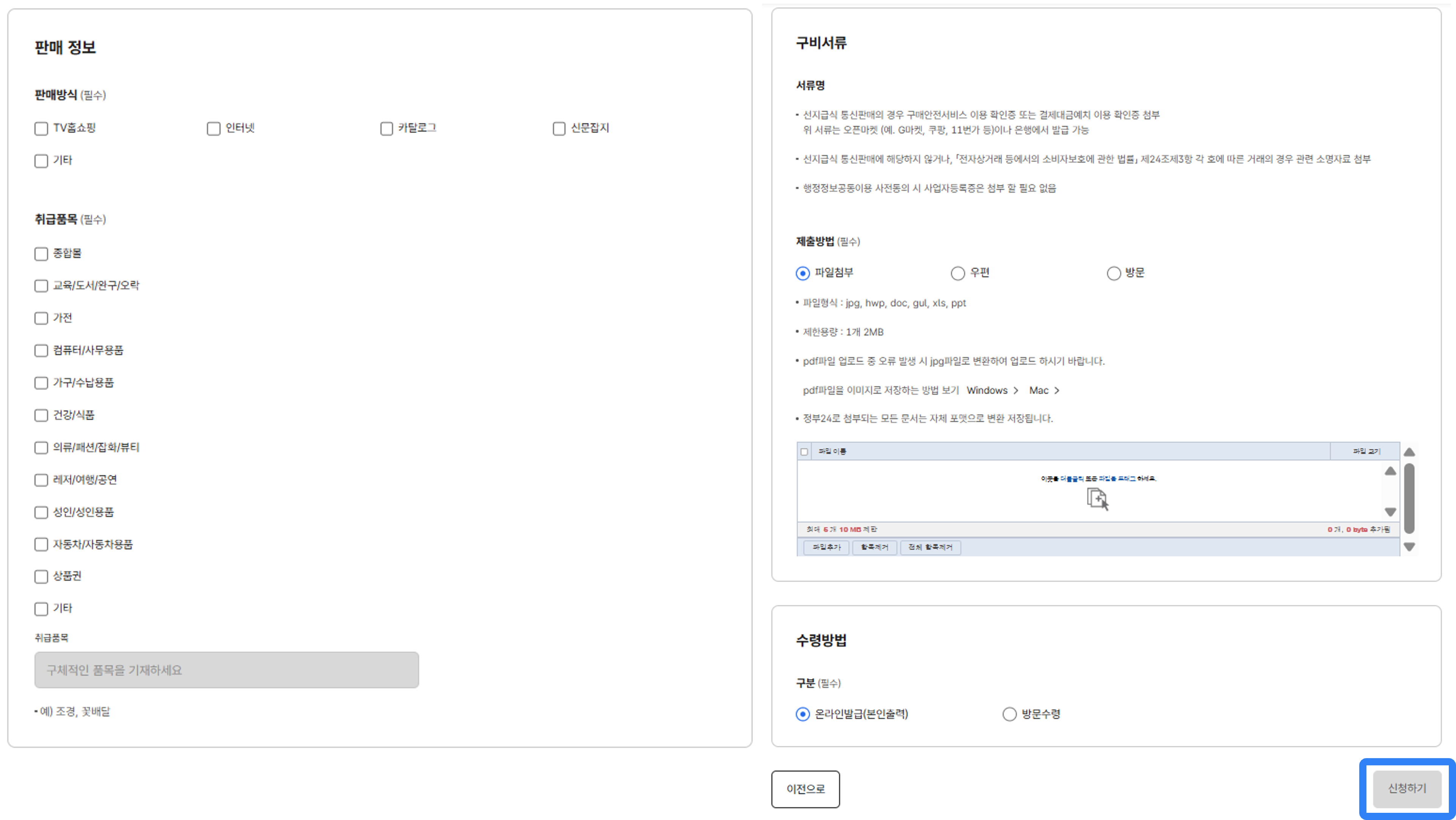 4) 상호 정보·대표자 정보·판매 정보 입력, 구비서류(구매안전서비스 이용확인증) 첨부, 수령방법 선택 후 ‘신청하기’ 버튼 클릭하면 완료!
