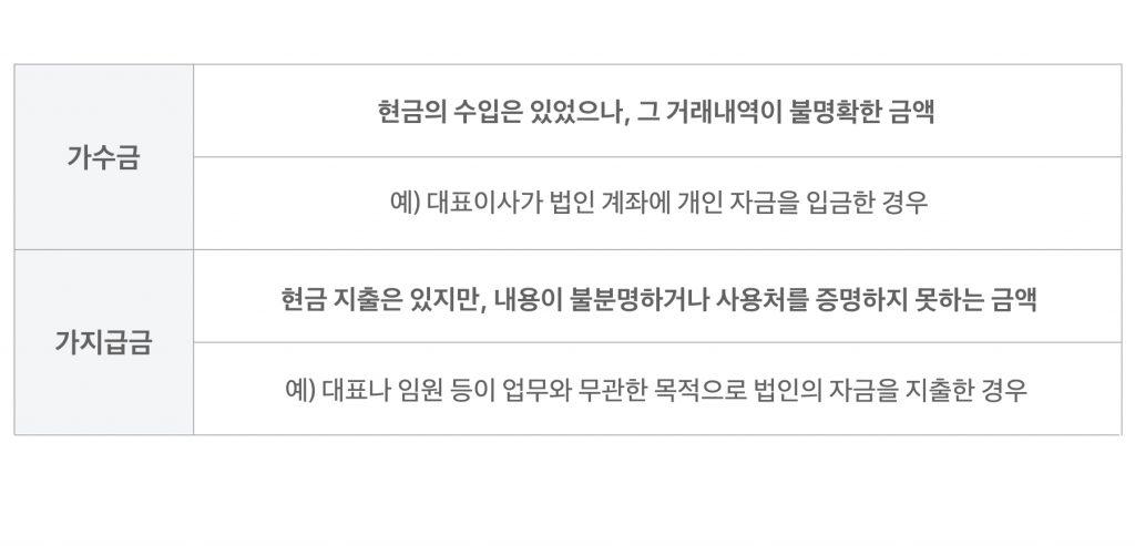 - 가공 세금계산서 매입 또는 가수금, 가지급금의 발생은 법인 세금이 늘어나는 원인이 될 수 있기 때문에 주의해야 해요.