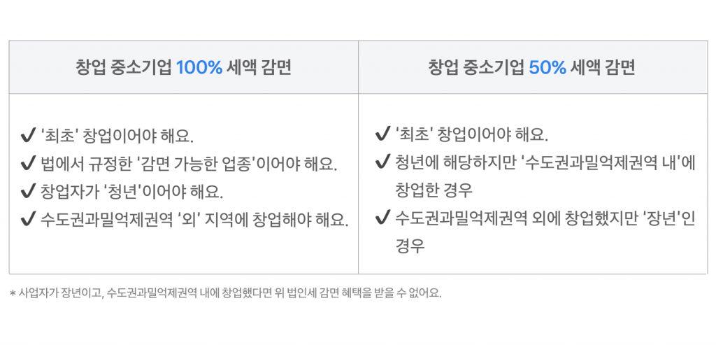 중소기업이나 스타트업에 해당한다면 ‘창업 중소기업 세액 감면 혜택’을 통해 법인세액을 줄일 수 있어요. 지원 조건에 해당한다면 법인세를 5년 동안 50%~최대 100%까지 감면받을 수 있는데요. 구체적인 조건은 다음과 같아요.