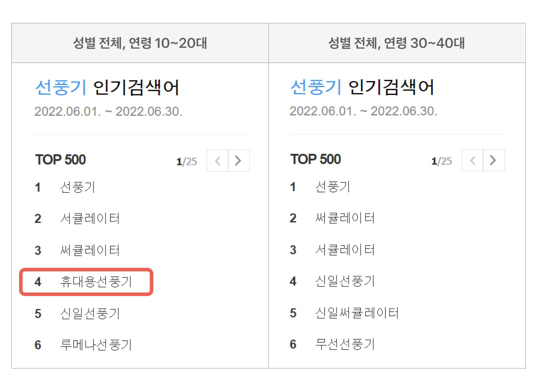 그래서 올 여름에 10~20대를 타겟으로 선풍기를 판매하고 싶은 사장님이라면, 수많은 선풍기 종류 중에서도 ‘휴대용 선풍기’라는 아이템을 구체적으로 선정할 수 있어요.