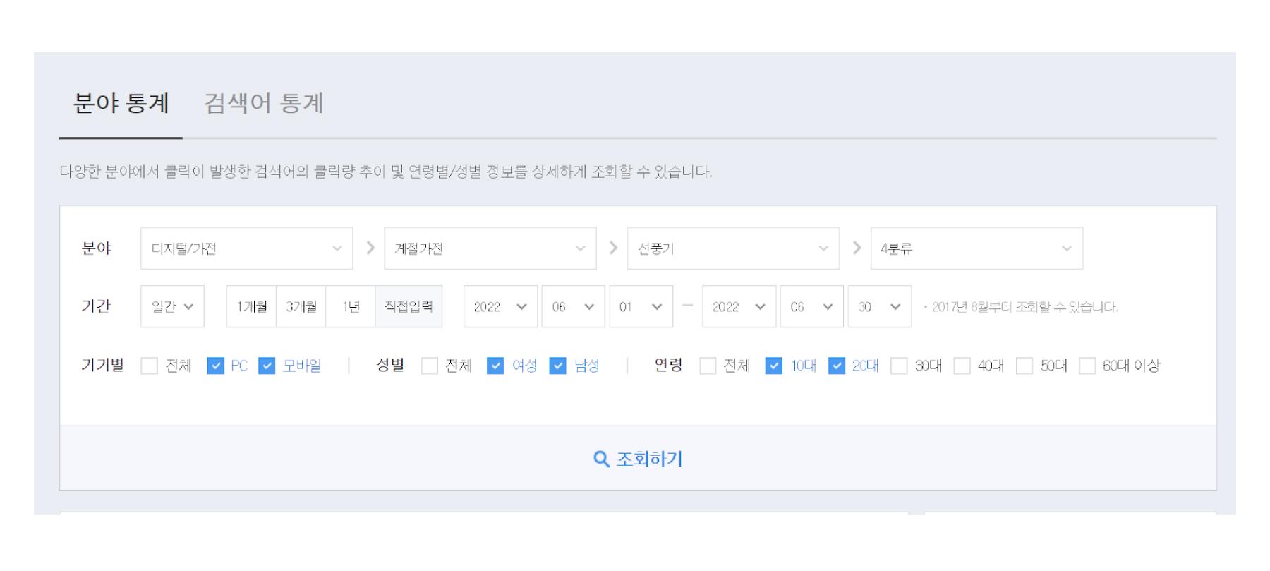 여기서 원하는 고객의 연령, 성별 등을 조회하고 ‘인기검색어’를 살펴보세요. 해당 조건의 고객이 특히 많이 검색한 키워드를 확인할 수 있어요. 아래 예시를 보면, 같은 선풍기라도 연령대별로 검색한 키워드가 미세하게 다르다는 것을 알 수 있죠.