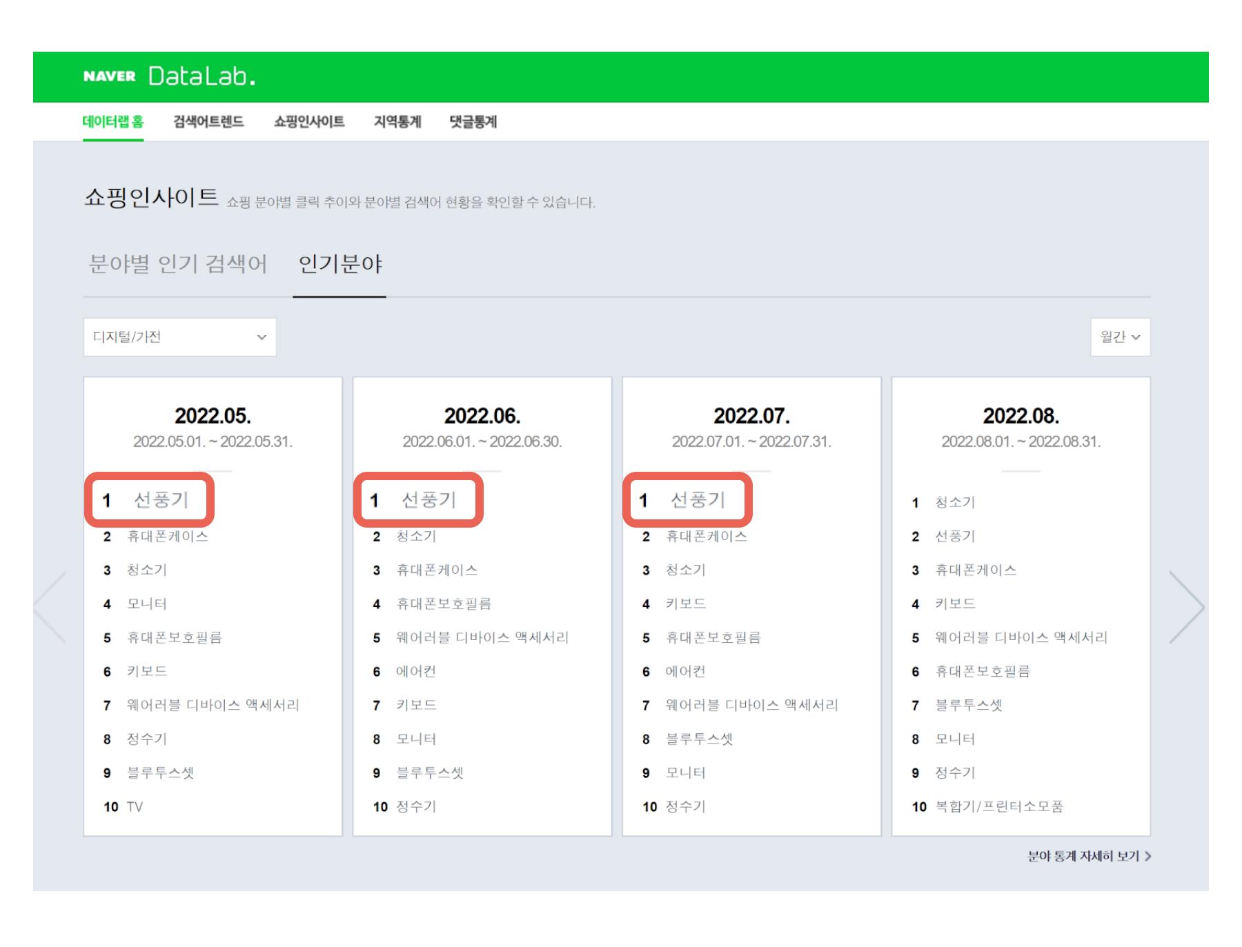 예를 들어 이번 여름철 판매할 아이템을 고른다고 상상해 볼게요. 올여름은 아직 오지 않았으니, 작년 여름의 결과를 살펴봐야겠죠. 위 예시를 보면 22년 5월~7월 사이에는 선풍기가 부동의 1위를 차지한다는 걸 알 수 있어요.