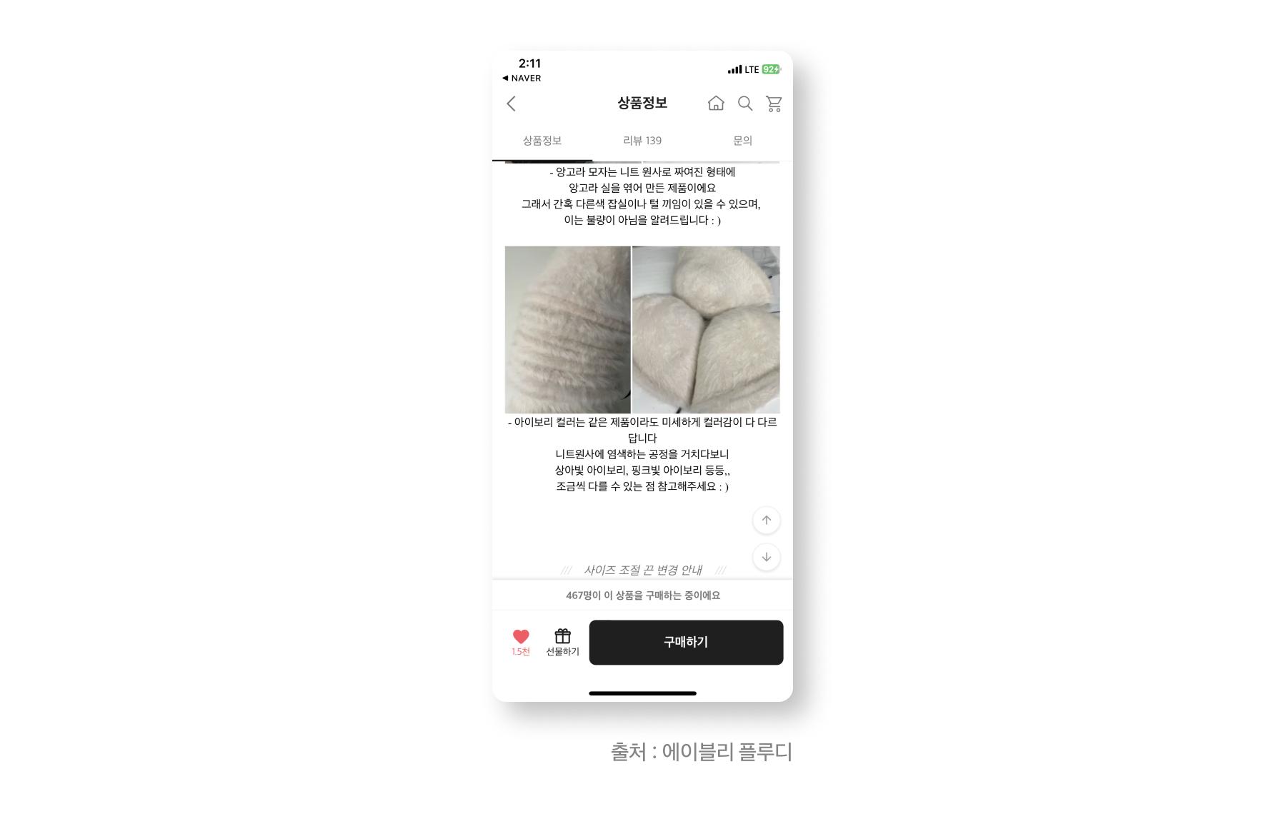 ✔ 색상 및 크기 오차 안내하기 경우에 따라 색상과 크기에 오차가 있는 제품은 미리 안내해 주세요. 아이보리 색이라는 사진과 설명만 믿고 샀는데, 생각보다 핑크빛이 많다면 고객 입장에서는 당황스러울 거예요. 상세페이지에서 먼저 안내하면 고객은 해당 오차를 인지했기 때문에 상품에 대한 불만을 덜 수 있어요.