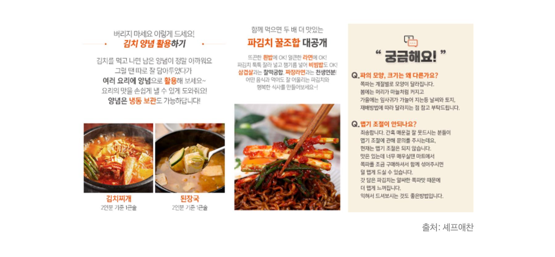 맛있어 보이는 파김치지만 지금 살지 말지 고민이 되는 고객을 위해 ‘함께 먹으면 좋은 꿀조합’이나 ‘양념 활용법’ 등 구매 이후 상품의 활용법을 자세히 알려줬어요. 고민하던 지점이 해결되니 구매를 하지 않을 이유가 없어지게 되었죠.