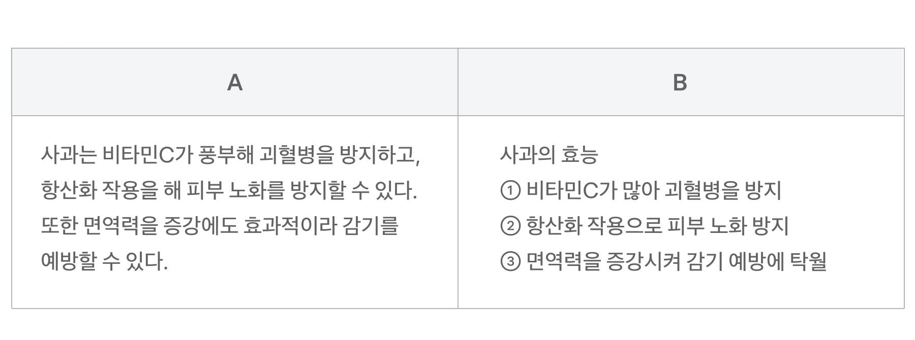 ✔ 상품 장점은 줄글 대신 번호를 매겨서 설명하기 이해를 위해 예시로 ‘사과의 효능’을 소개해 볼게요. A와 B 중 내용이 한눈에 더 잘 들어오는 것이 무엇인가요?