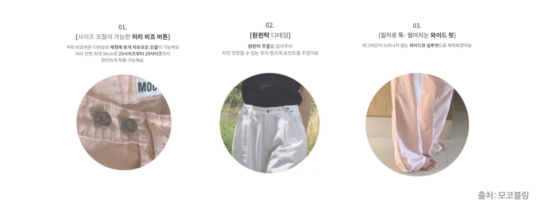 위 쇼핑몰은 바지의 장점을 숫자+소제목과 설명+관련 이미지의 조합으로 구분했어요. 특히 의류 쇼핑몰은 상품 이미지가 많아 줄글만 많으면 대부분 보지 않고 지나갈 수 있어요. 하지만 번호로 확실하게 표시한 덕분에 상품의 장점을 한눈에 확실히 어필할 수 있게 되었어요.