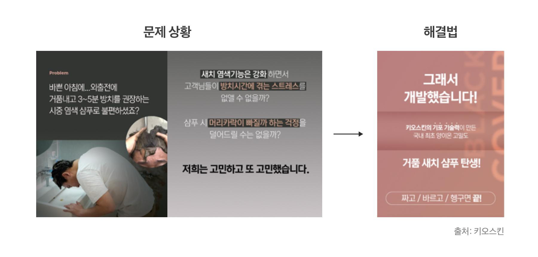 위 예시는 거품 새치 샴푸의 상세페이지예요. 고객들이 다른 새치 샴푸를 사용하면서 겪는 불편함을 통해 공감을 만들어냈어요. 그 후 판매하는 상품이 불편을 해결했다고 이야기해요. 실제로 다른 새치 샴푸를 사용하면서 같은 불편을 느꼈던 고객이라면 이 상품을 구매할 수밖에 없을 거예요.