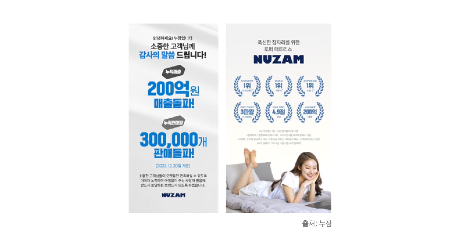 위 예시에서는 누적 매출과 누적 판매량을 특히 강조했어요. 그 외에 인기 브랜드 1위, 리뷰 수 1위 등의 숫자도 눈에 띄죠. 단순히 ‘리뷰가 많다’고 얘기하는 게 아니라 침대와 캠핑 토퍼 카테고리에서 리뷰 수가 1위라는 정확한 숫자로 이야기하고 있어요.