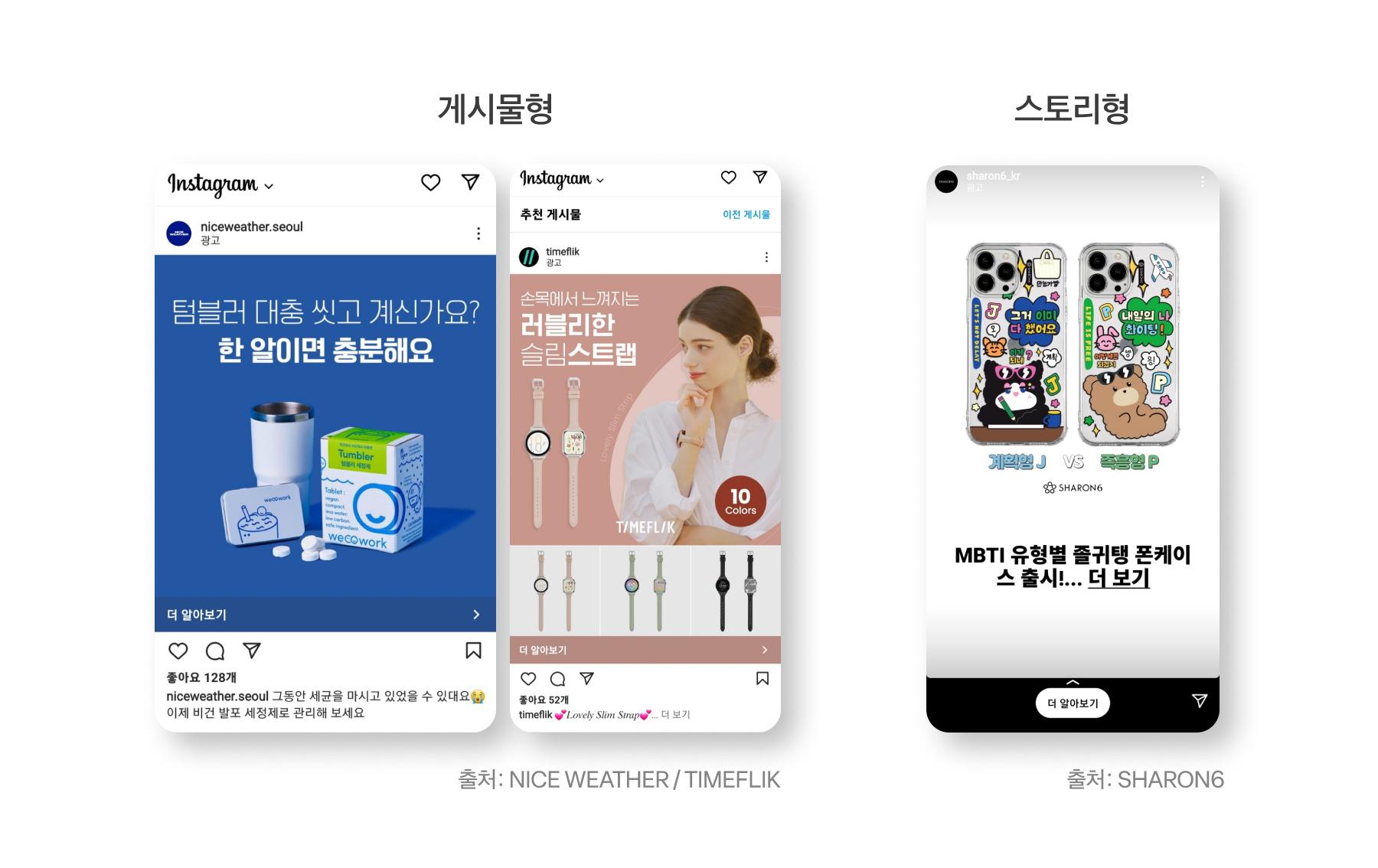 ✅ 인스타그램 인스타그램 광고는 크게 피드와 스토리 탭에 노출되고 있는데요. 이미지 중심 콘텐츠가 주로 업로드되는 인스타그램 특성상, 광고 또한 이미지형으로 이루어지고 있어요.