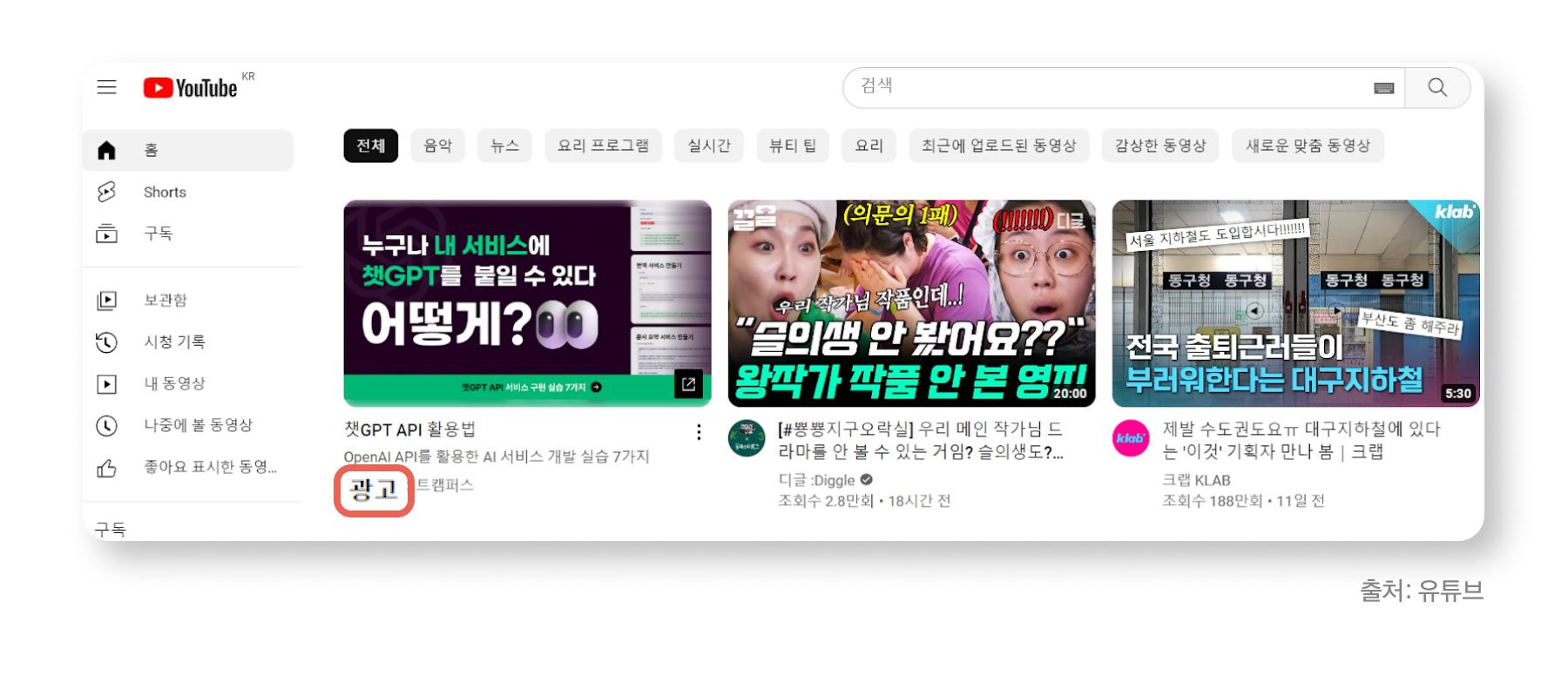 유튜브에서도 동영상 광고 외에 카피가 활용된 이미지 형태 광고를 찾아볼 수 있는데요. 특정 동영상 시청 화면 내에서 보이는 배너 형태 광고의 경우 타 매체 광고와 유사해요.