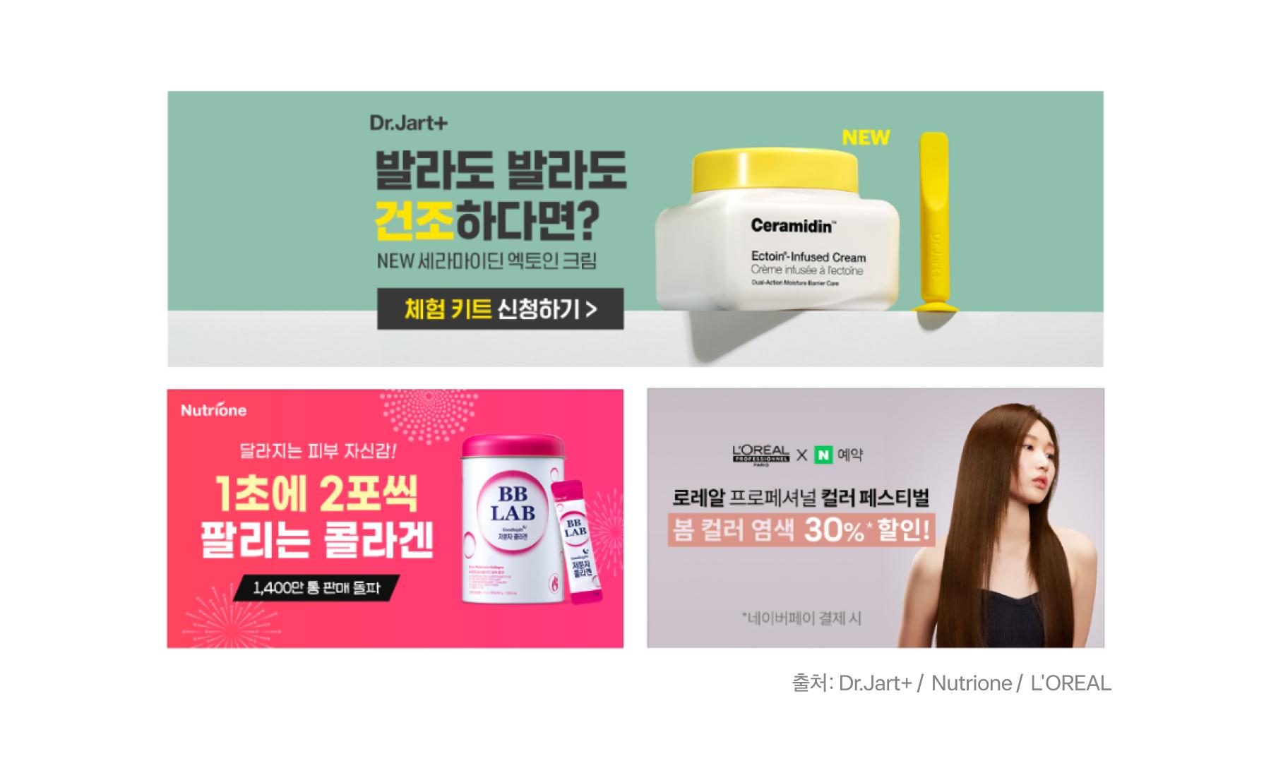 ✅ 네이버 이미지형 배너 광고 주로 네이버 PC 웹 메인 화면에 노출되는 광고 유형이에요. 카피에서 강조하고 싶은 문구에 다른 색을 넣거나 폰트 크기를 키우기도 하고요. 광고 배너 안에 CTA 버튼을 넣어서 고객의 행동을 유도하기 용이하게 만들 수도 있어요.