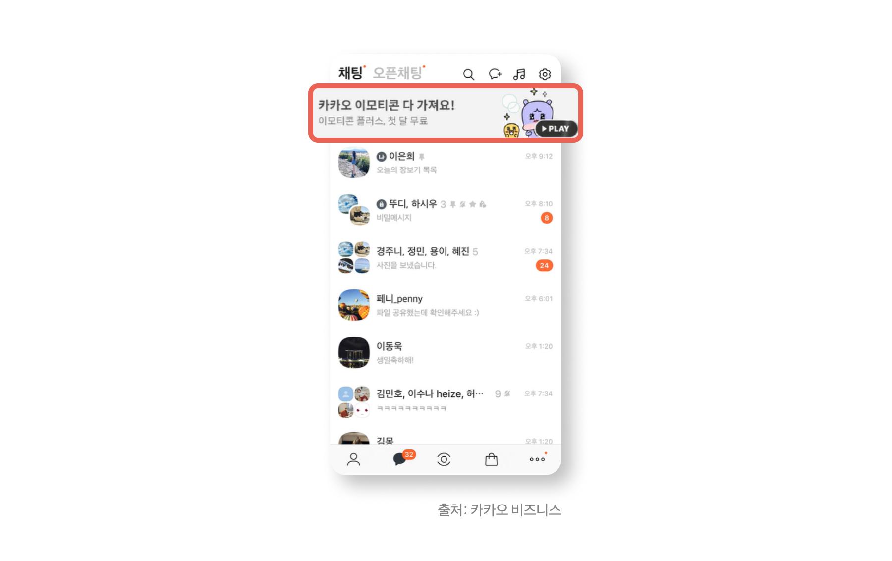 카카오톡 채팅 목록 탭 상단에 위치한 배너 광고도 텍스트 중심형이라고 볼 수 있어요. 사용자 입장에서 볼 때 일반 채팅과 함께 텍스트형 배너가 눈에 들어오기 때문에 그만큼 강렬한 카피가 필요한데요. 실제 카피 예시들을 살펴볼게요.