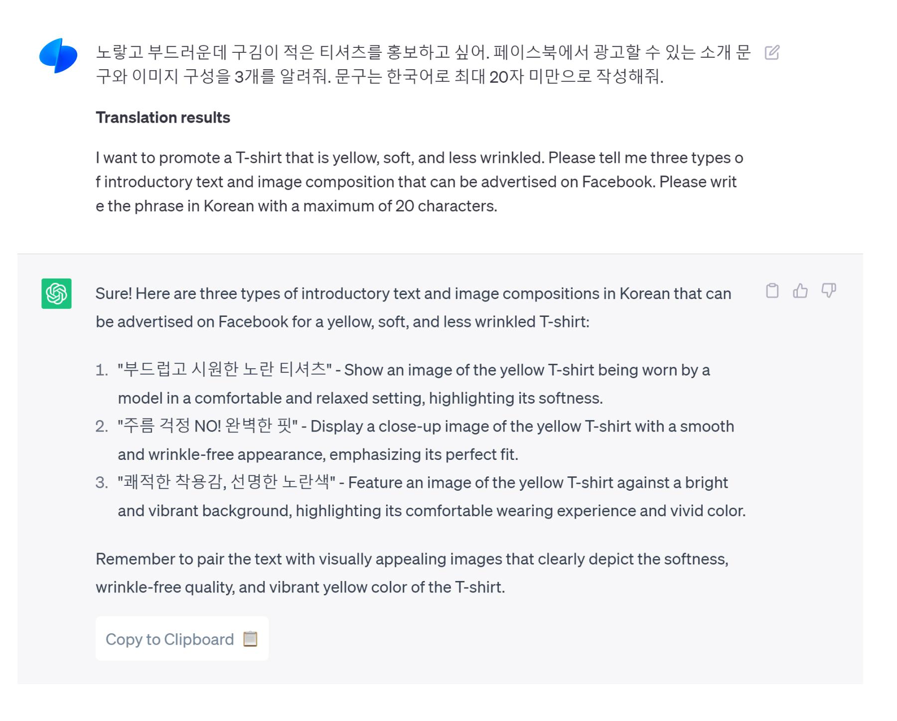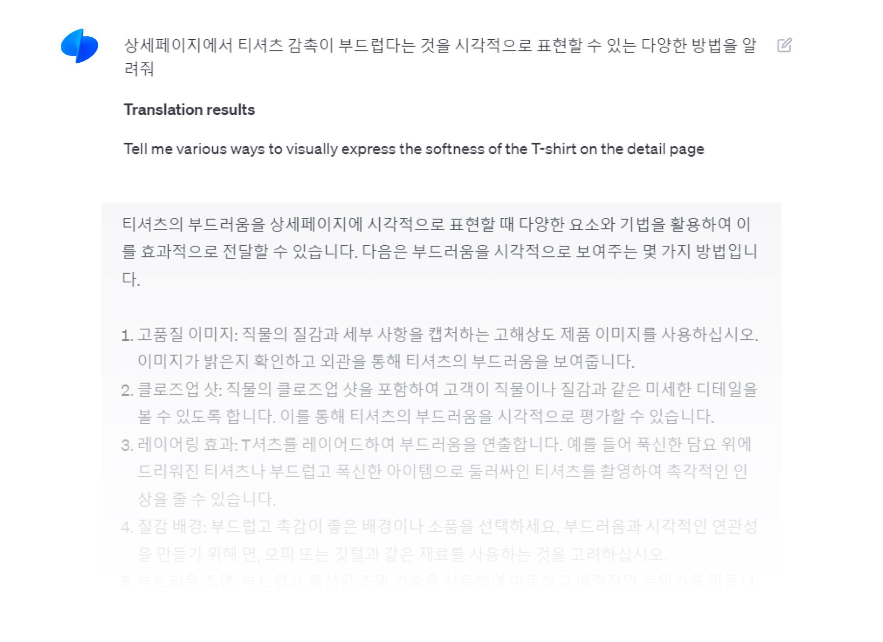 ✔ 질문과 요청은 영어로 하기 챗GPT는 영어 기반인 서비스이기 때문에 한글보다는 영어로 요청했을 때 결과물의 완성도가 높고 더욱 자연스러운 답변을 얻을 수 있어요. 이때 파파고나 구글 번역기를 활용하면 더욱 자연스럽게 번역할 수가 있어요.