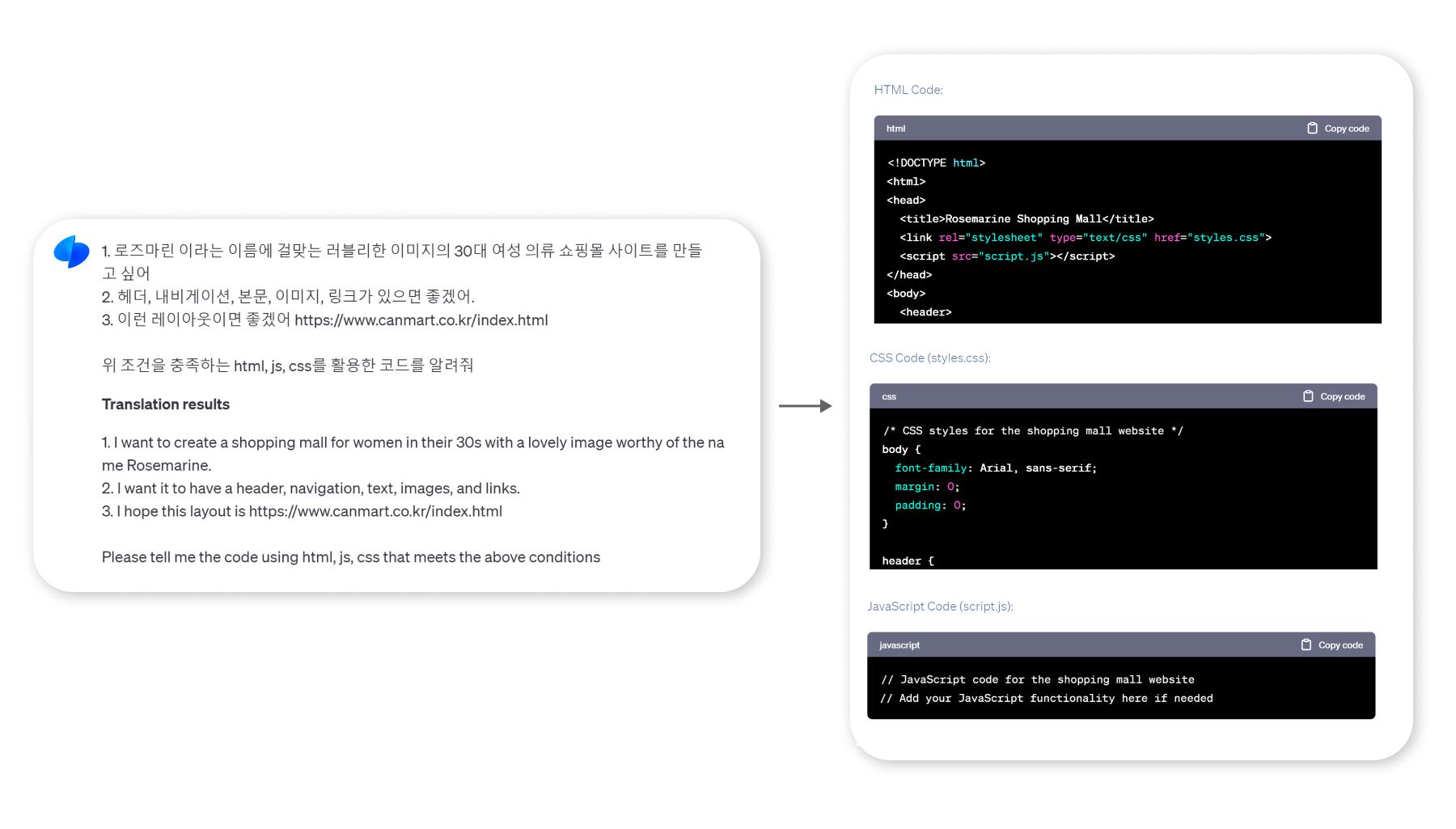 챗GPT에 웹페이지의 컨셉 / 구성요소 (헤더, 내비게이션, 본문, 이미지, 링크 여부) / 레이아웃 예시 페이지 / 이미지나 링크 등을 알려주면서 이를 html, js, css로 나타낸 코드를 알려달라고 하면 돼요.