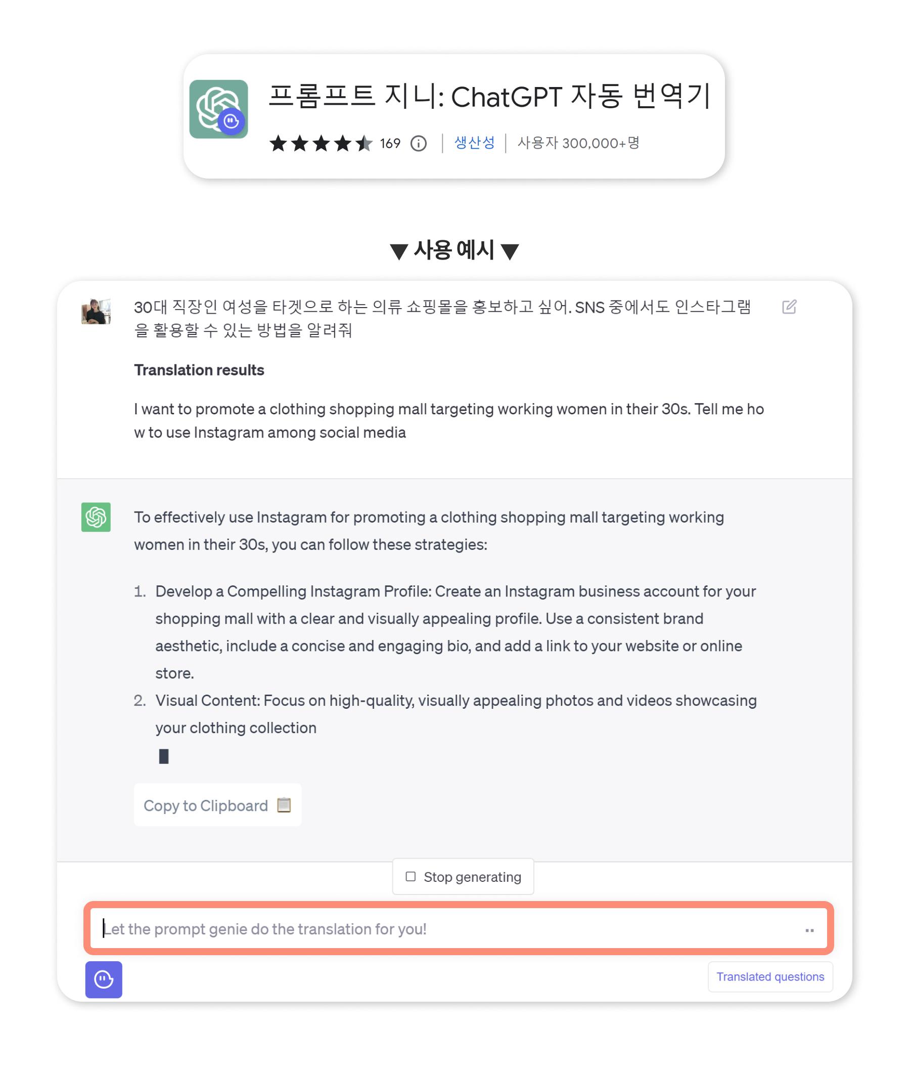 ✔ 프롬프트 지니 : 번역의 번거로움을 줄여주는 프로그램 이 글에서도 설명했다시피, 챗GPT에게 질문을 할 땐 영어로 묻는 것이 더 효과적이에요. 이를 위해 많은 분들이 번역기를 옆에 두고 번역된 질문을 다시 채팅창에 옮기실텐데요. 프롬프트 지니는 질문을 채팅창에 입력하는 동시에 영어로 번역해 주기 때문에 이러한 번거로움을 해소할 수 있어요.