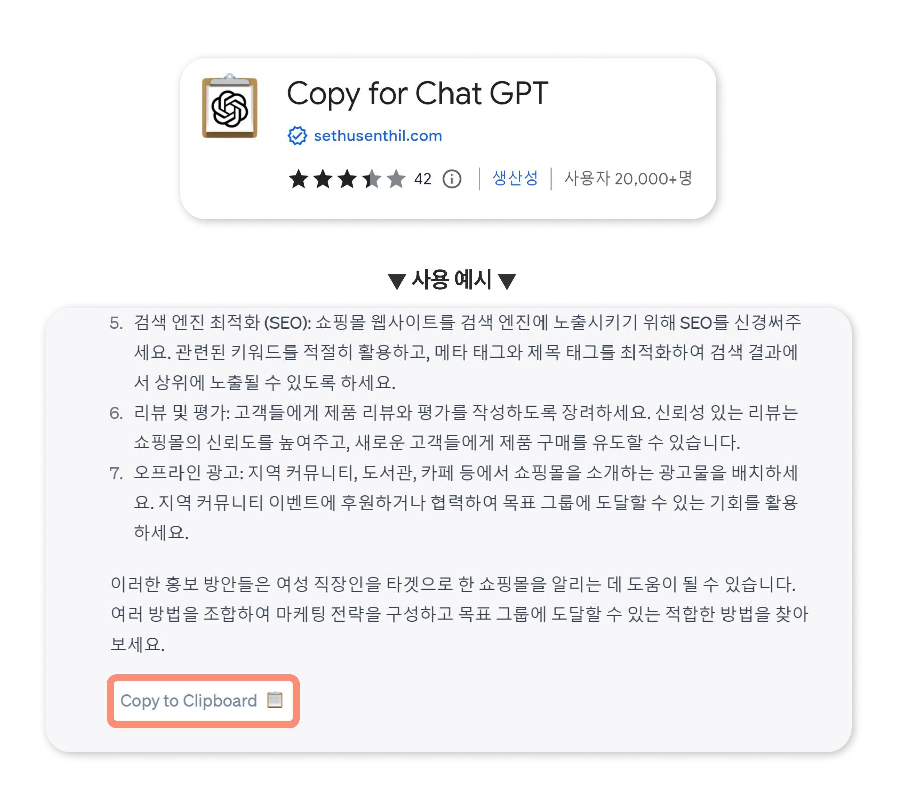 ✔ Copy for Chat GPT : 복사, 붙여넣기 버튼을 만들어주는 프로그램 답변을 활용하기 위해 텍스트를 드래그해서 복사, 붙여 넣기를 해야 하는데요. 이 과정이 번거로우신 사장님을 위한 확장 프로그램이에요. 답변 맨 아래에 생긴 버튼을 클릭하면 간단하게 텍스트 전체가 복사돼요.