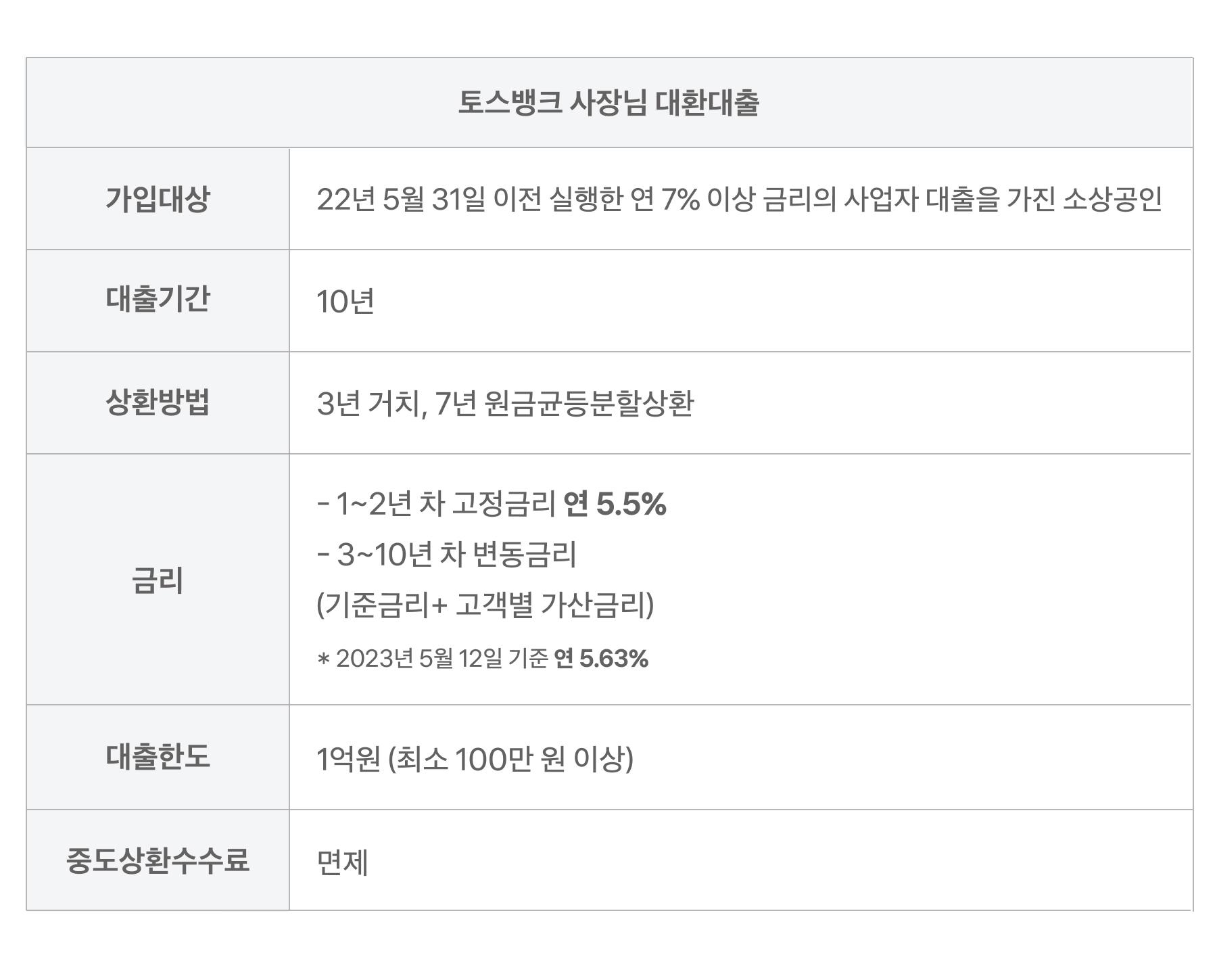 이미 금리 연 7% 이상의 사업자대출 상품을 이용하고 계시다면 ‘토스뱅크 사장님 대환대출'을 통해 5.5% 대출로 이자 부담을 줄일 수 있어요.