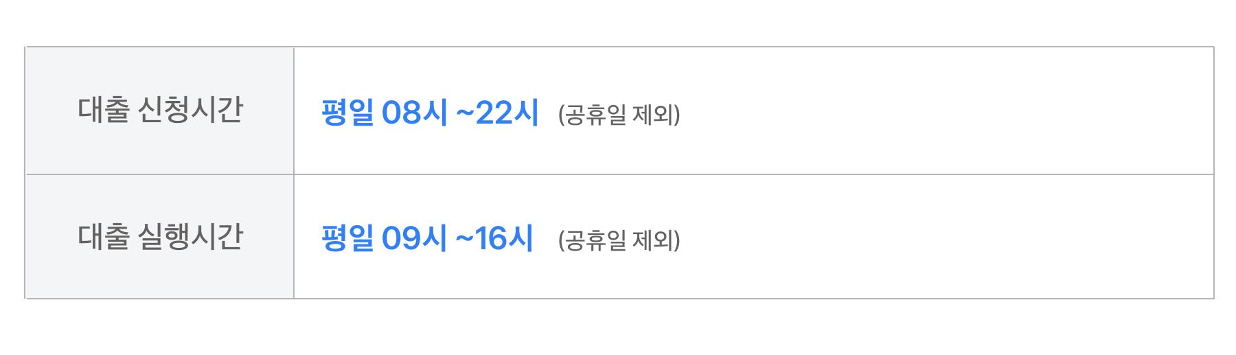 - 대출 실행시간 : 평일 09시 ~16시 (공휴일 제외)