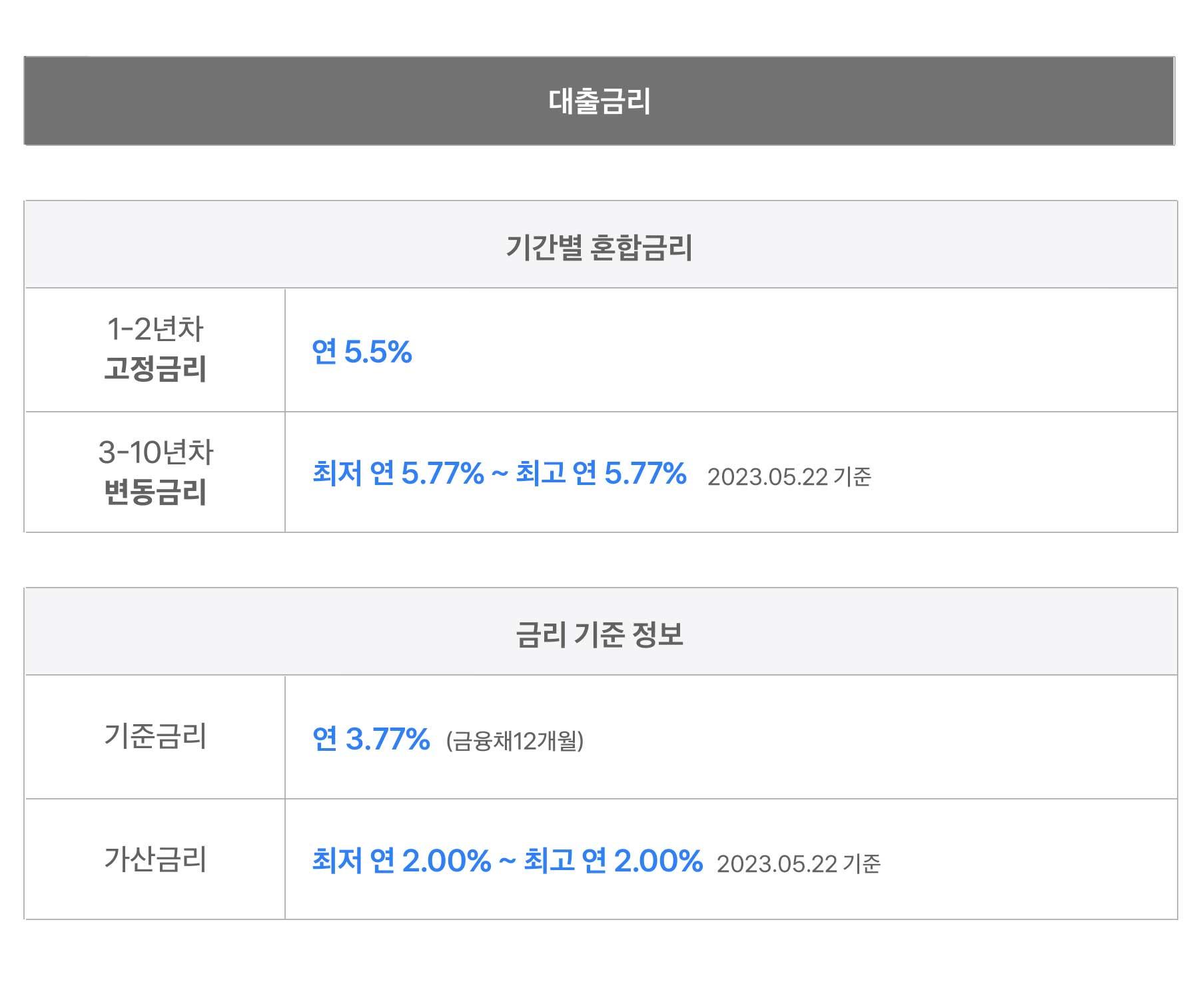 - 3~10년차 변동금리 : 최저 연 5.77% ~ 최고 연 5.77% (2023.05.21 기준)