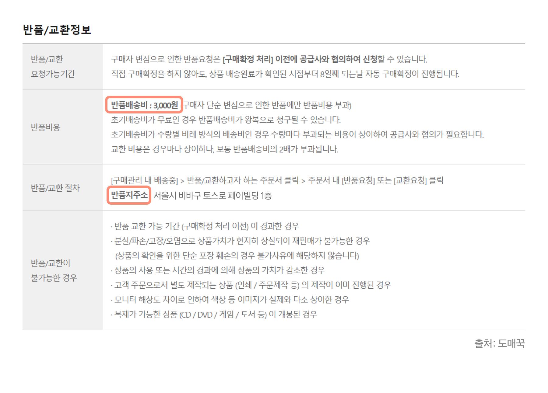 해당 정보는 일반적으로 도매사이트 개별 상품 페이지 하단에서 확인 가능해요. 도매업체마다 반품 규정이나 비용이 다르기 때문에 상품등록할 때 주의가 필요해요.