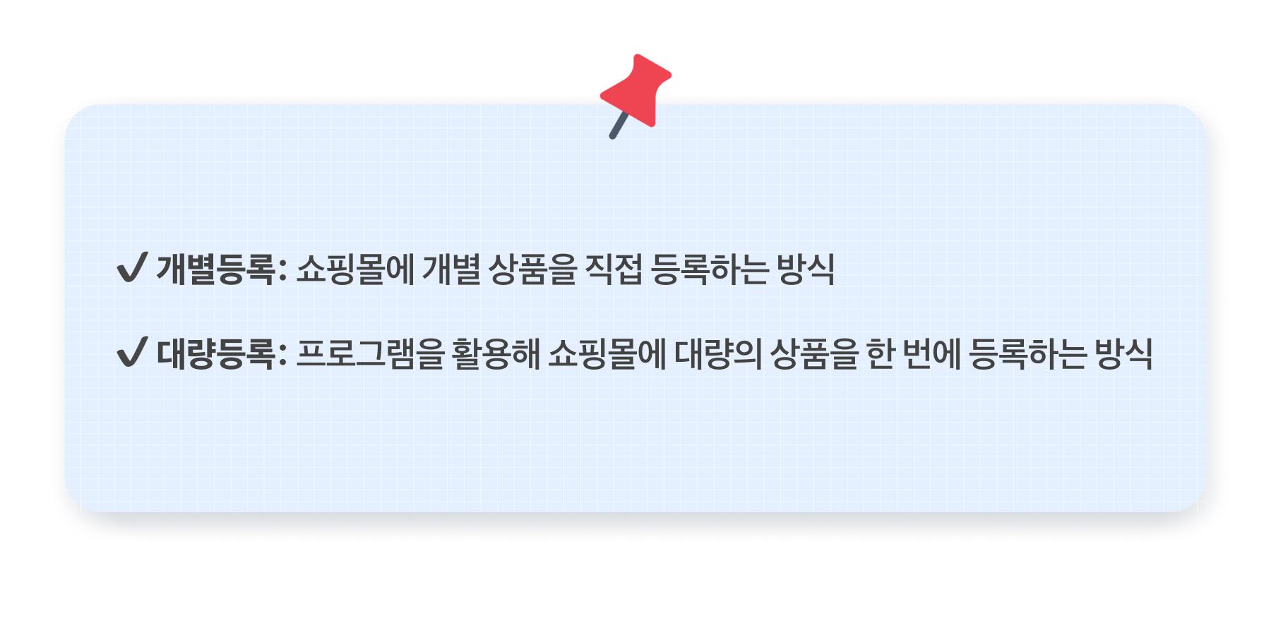 상품등록 방식에 정답이 있는 건 아니기 때문에, 사장님의 목표에 따라 개별등록 또는 대량등록 중 선택이 가능해요. 소수의 상품 판매에 집중하고 싶다면 개별등록을, 상품을 대량으로 소싱해 성과가 좋은 제품을 찾고 싶다면 대량등록 방식을 활용할 수 있어요.