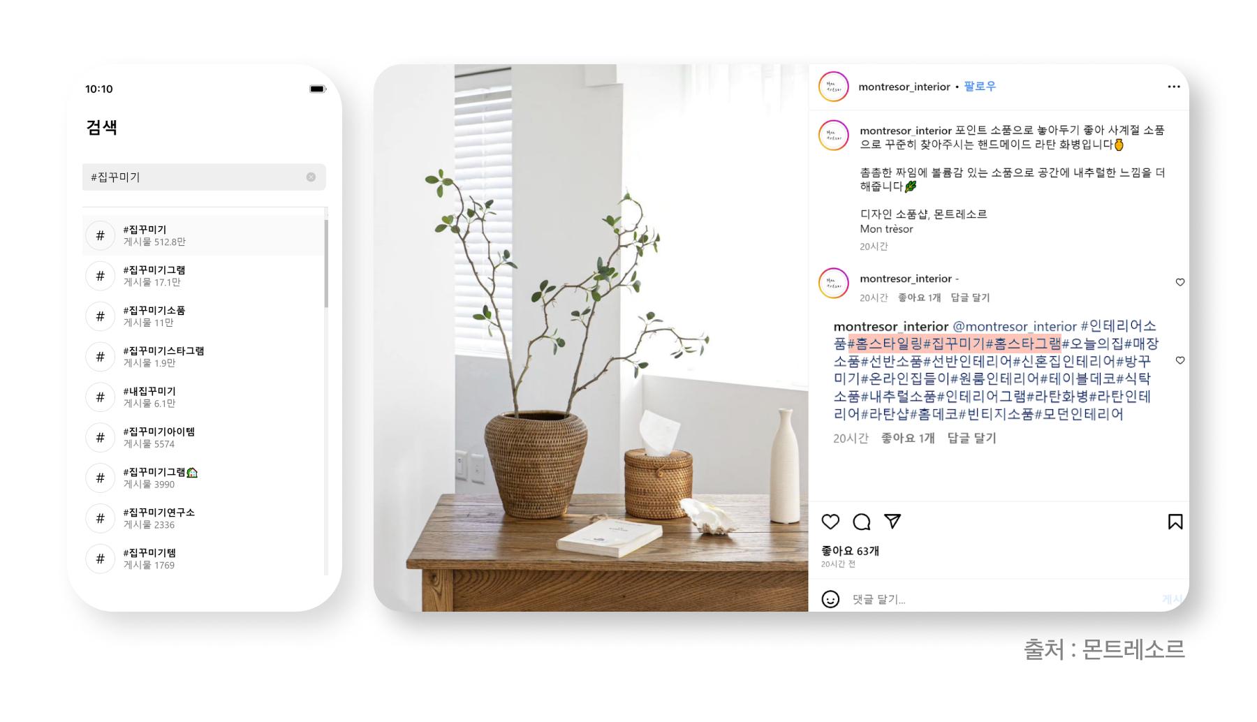인기 게시물을 살펴보며 추가적으로 활용할 수 있는 커뮤니티 해시태그를 찾을 수 있어요. #집꾸미기 이외에도 #홈스타그램, #인테리어소품 키워드가 자주 활용된다는 걸 확인할 수 있어요. 그렇다면 관련 콘텐츠를 업로드 할때마다 #인테리어 #집꾸미기 #홈스타그램 #인테리어 소품 해시태그를 자주 활용하면 돼요.이와 같이 제품이나 브랜드에 맞는 커뮤니티 해시태그를 검색해 보고, 어떤 콘텐츠와 해시태그가 인기 있는지 꼭 확인해 보세요.