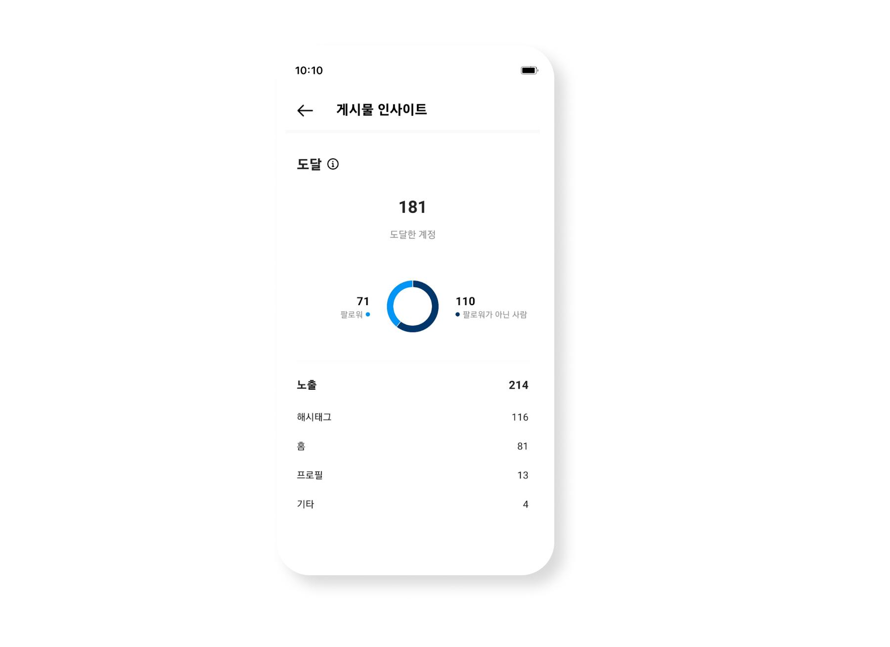 프로페셔널 계정을 사용하시는 경우, 게시물마다 ‘인사이트’를 확인할 수 있어요. 게시물 인사이트에서 노출도를 확인하고, 해시태그와 홈 탭에 얼마나 콘텐츠가 노출되고 있는지 확인해 보세요.