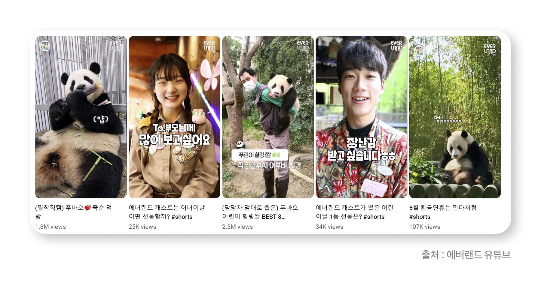 쇼츠에 꼭 맞는 브랜드 스토리를 만들어 보세요. CU와 에버랜드 유튜브 채널을 참고해 보시면 좋을 것 같아요. CU는 ‘편의점 고인물'이란 공감 백배 편의점 스토리로 사랑받았어요. 에버랜드는 최근 인기 있는 푸바오, 에버랜드 캐스트 인터뷰 영상으로 소비자와 소통하고 있어요.