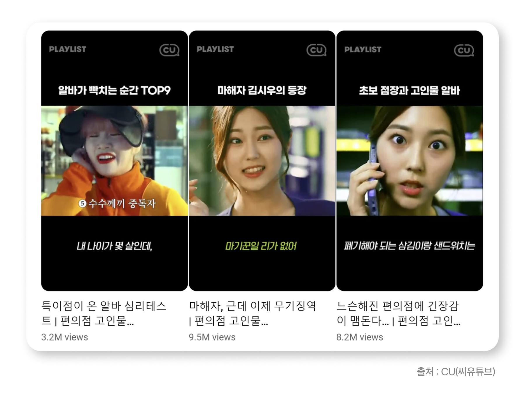 숏폼에 광고, 마케팅을 접목하는 사례가 점차 늘고 있어요. 대표적인 사례로 CU는 편의점 이야기를 다룬 1분 영상 ‘편의점 고인물’을 공개했어요. 편의점 아르바이트생이 겪는 다양한 에피소드를 짧고, 재미있게 다루고 있어서 많은 사람들의 공감을 얻었고, 공개 39일 만에 1억 뷰를 돌파했어요.