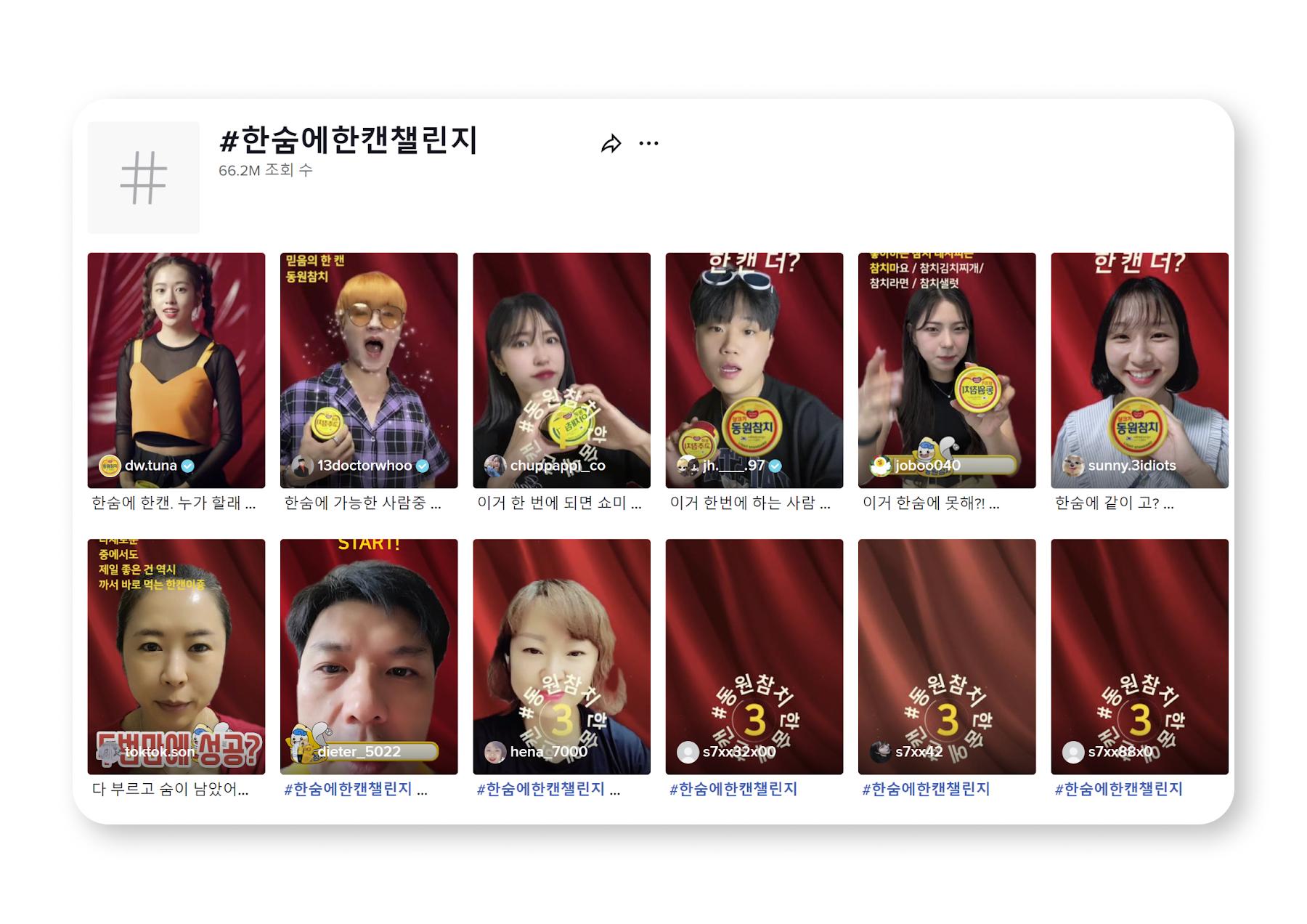 동원F&B의 동원참치 '#한숨에한캔' 챌린지는 틱톡에서 6천만 조회 수를 기록하며 Z세대의 많은 관심을 받았어요. 참치 레시피를 한 호흡만에 빠르게 읽어내는 방식이라 쉽고, 동원참치 브랜드 스티커도 활용할 수 있어 재밌는 챌린지라는 평을 받았어요.