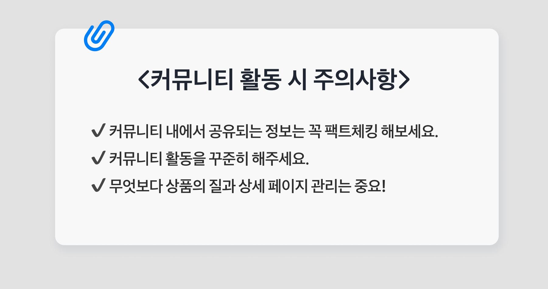 커뮤니티에서 구매로 넘어온 고객들은 상품의 상세페이지를 보게 될 거예요. 그러나 커뮤니티 소개와는 다른 불편함을 느낀다면 오히려 브랜드에 대한 신뢰도는 낮아질 수밖에 없어요. 오히려 부정적인 입소문이 날 수도 있어요.