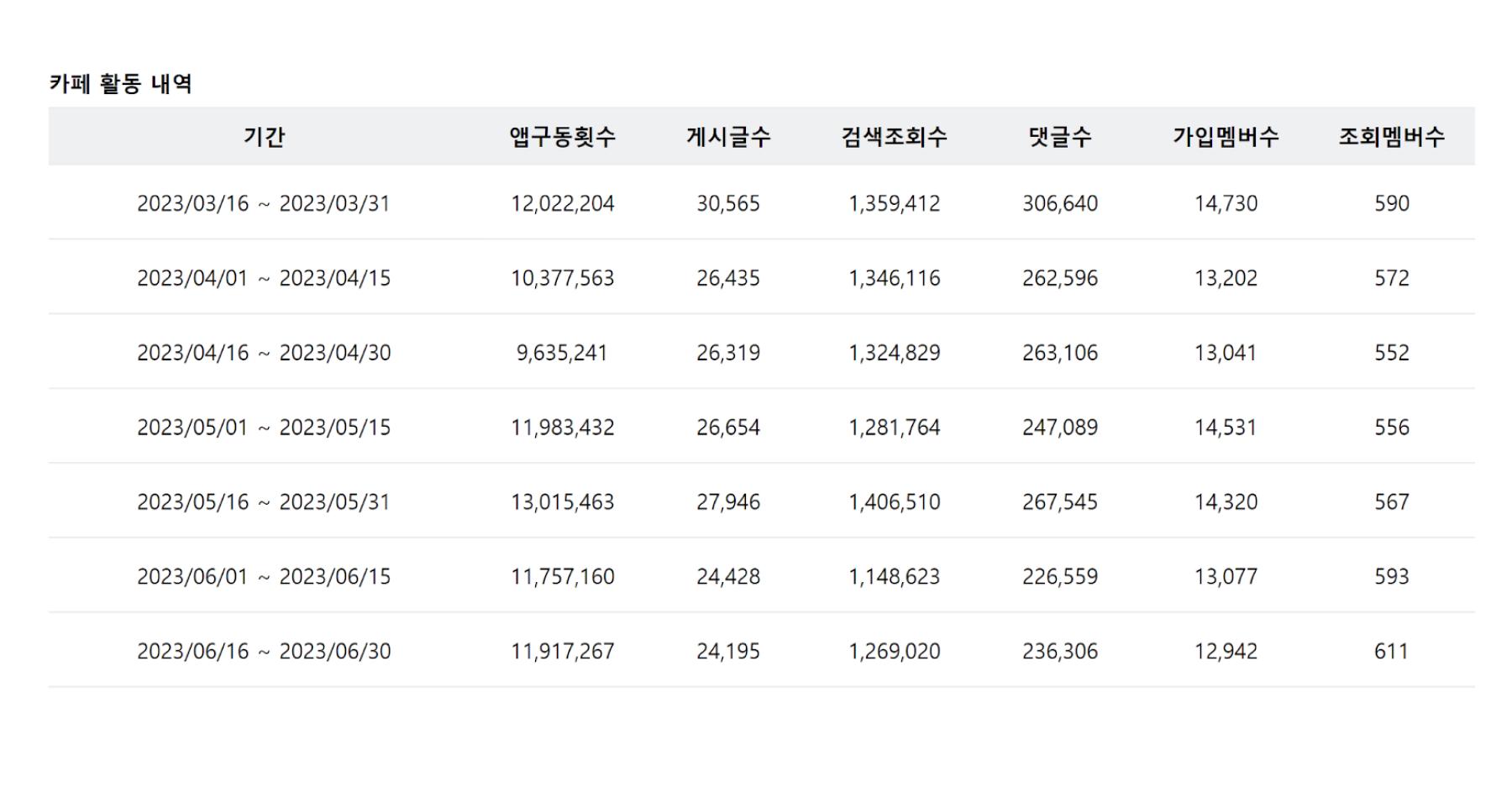 - 커뮤니티 랭킹, 검색조회 수, 댓글 수, 조회 멤버 수는 경쟁력 있는 커뮤니티를 나타내는 지표예요.