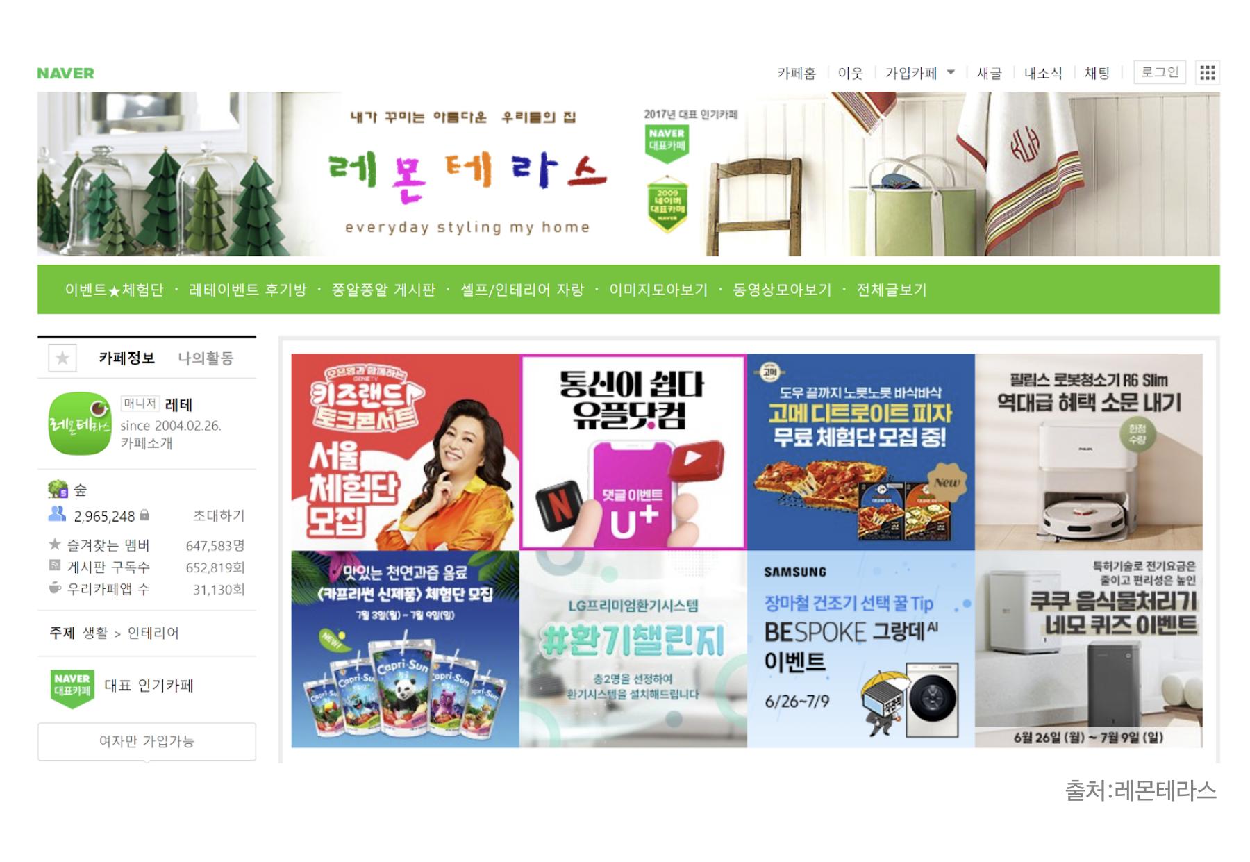 네이버 카페와 다음 카페에 활발하게 운영되는 온라인 커뮤니티가 많아요. 정말 다양한 주제로 커뮤니티가 개설되어 있고 사용자도 많은 편이에요. 검색이 쉽고 접근 가능성도 높은 편이고요. 커뮤니티 종류에 따라 다르겠지만, 정보나 팁 교환이 활발하고 체험단 등을 모집하기도 해요.