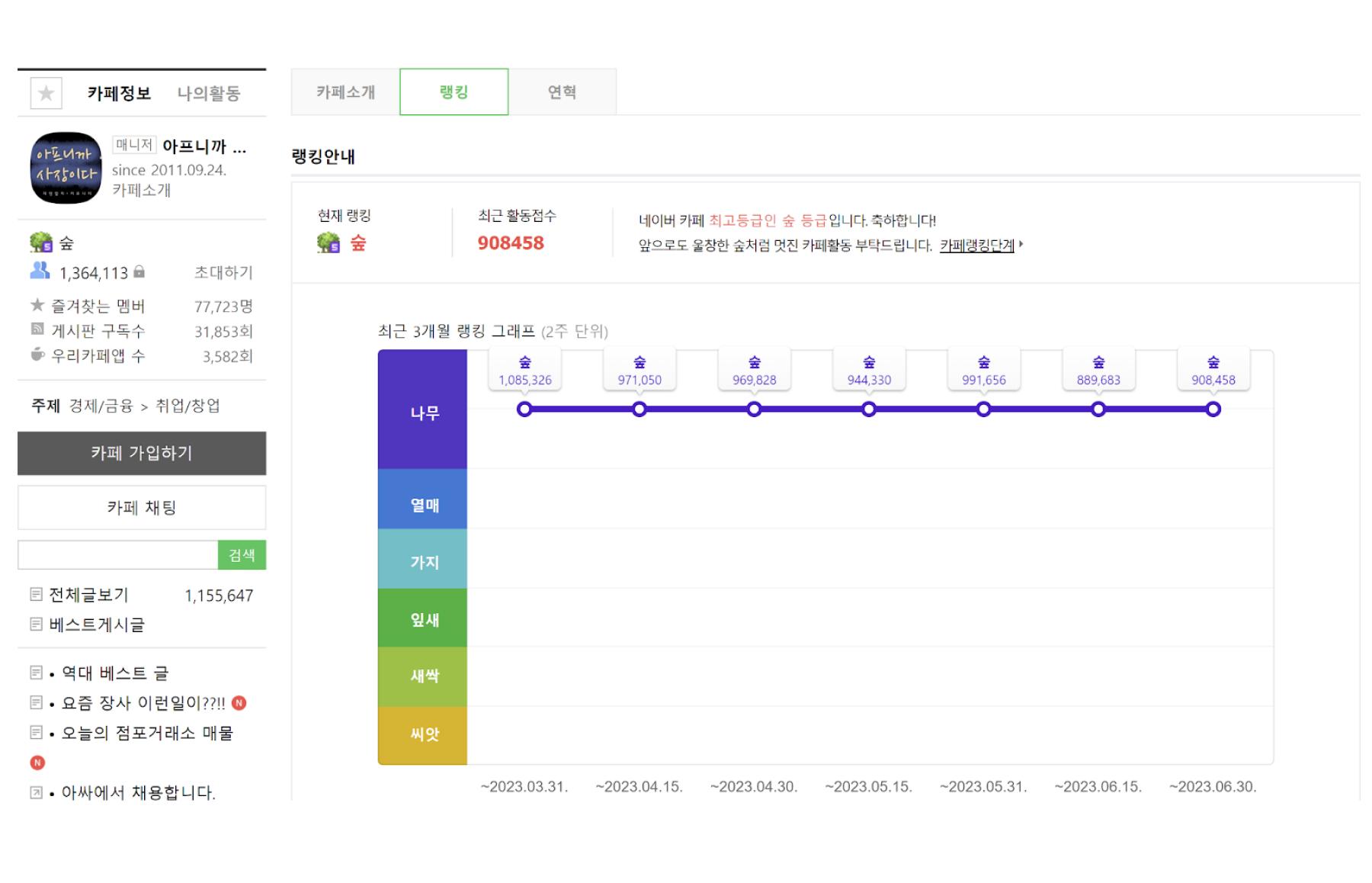 우선, 카페 랭킹을 확인해 보세요. 네이버 카페는 6단계로 나누어져 있는데요. 최근 3개월간 나무, 열매, 가지 단계에서 머무르고 있다면 제대로 운영되고 있는 커뮤니티라고 볼 수 있어요.