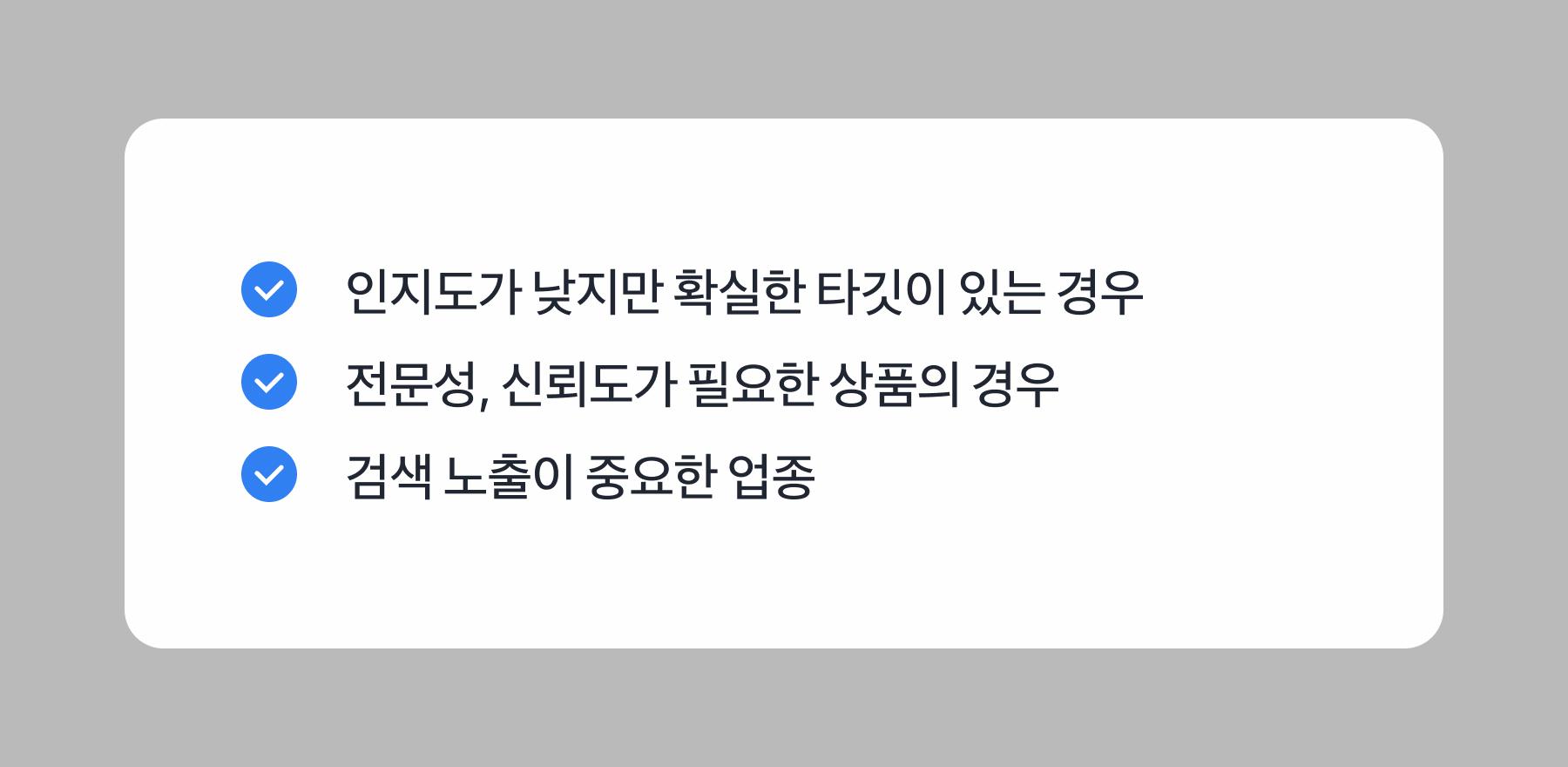 - 전문성, 신뢰도가 필요한 상품이거나 인지도는 낮지만 확실한 수요가 있는 상품, 검색 노출이 중요한 상품의 경우에는 블로그를 운영해 보면 좋아요.
