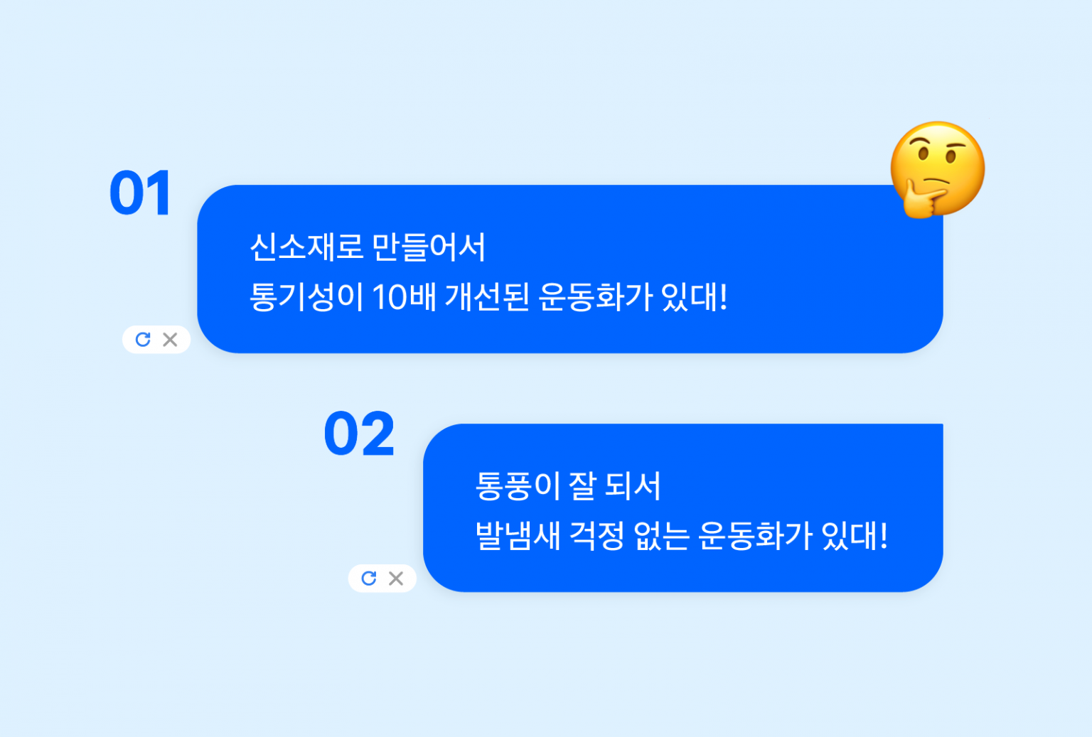 카피라이팅을 할 때도 기능을 우선적으로 설명하기보다 그 기능으로 고객이 어떤 만족감을 얻을 수 있는지 깊이 고민해 보는 게 좋아요. 위의 러닝화를 예로 들어 볼게요. 러닝화가 통기성이 좋은 최첨단 신소재로 만들었다고 말하기보다, 발 냄새 걱정을 없앨 수 있다고 써보는 것이죠.