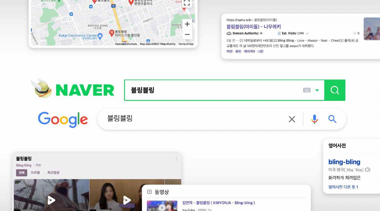 미러볼을 파는 쇼핑몰 이름을 ‘블링블링’으로 짓는다고 가정해 볼게요. 구글과 네이버에 검색을 해보니, ‘블링블링’이란 아이돌이 있네요. 검색 결과 페이지 1페이지 대부분이 아이돌 혹은 블링블링이란 신조어에 대한 뜻이 나와요.
