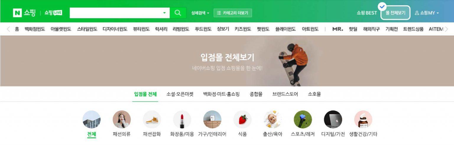 네이버쇼핑 > 몰 전체보기를 누른 뒤 희망하는 업종을 선택하면 해당 업종의 쇼핑몰들을 한눈에 확인할 수 있어요. 해당 쇼핑몰의 로고, 상품 개수, 스토어찜 개수 등 부가적인 정보도 확인할 수 있어 어떤 쇼핑몰이 인기 있는지 판단하는데 도움이 돼요.